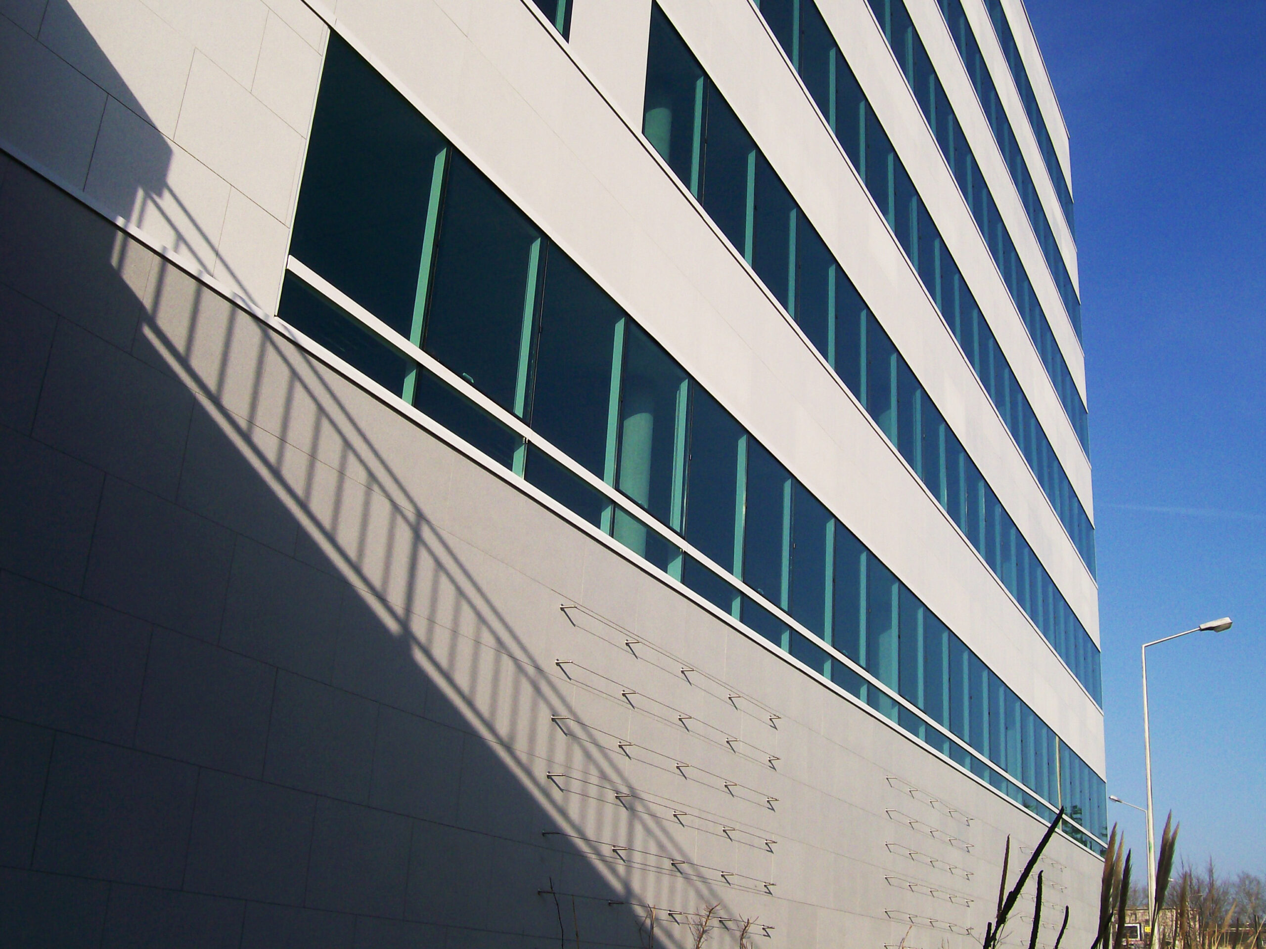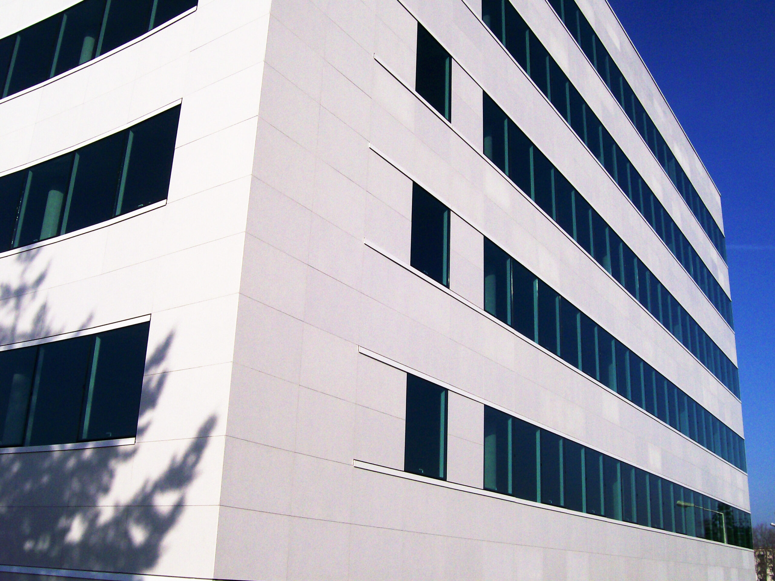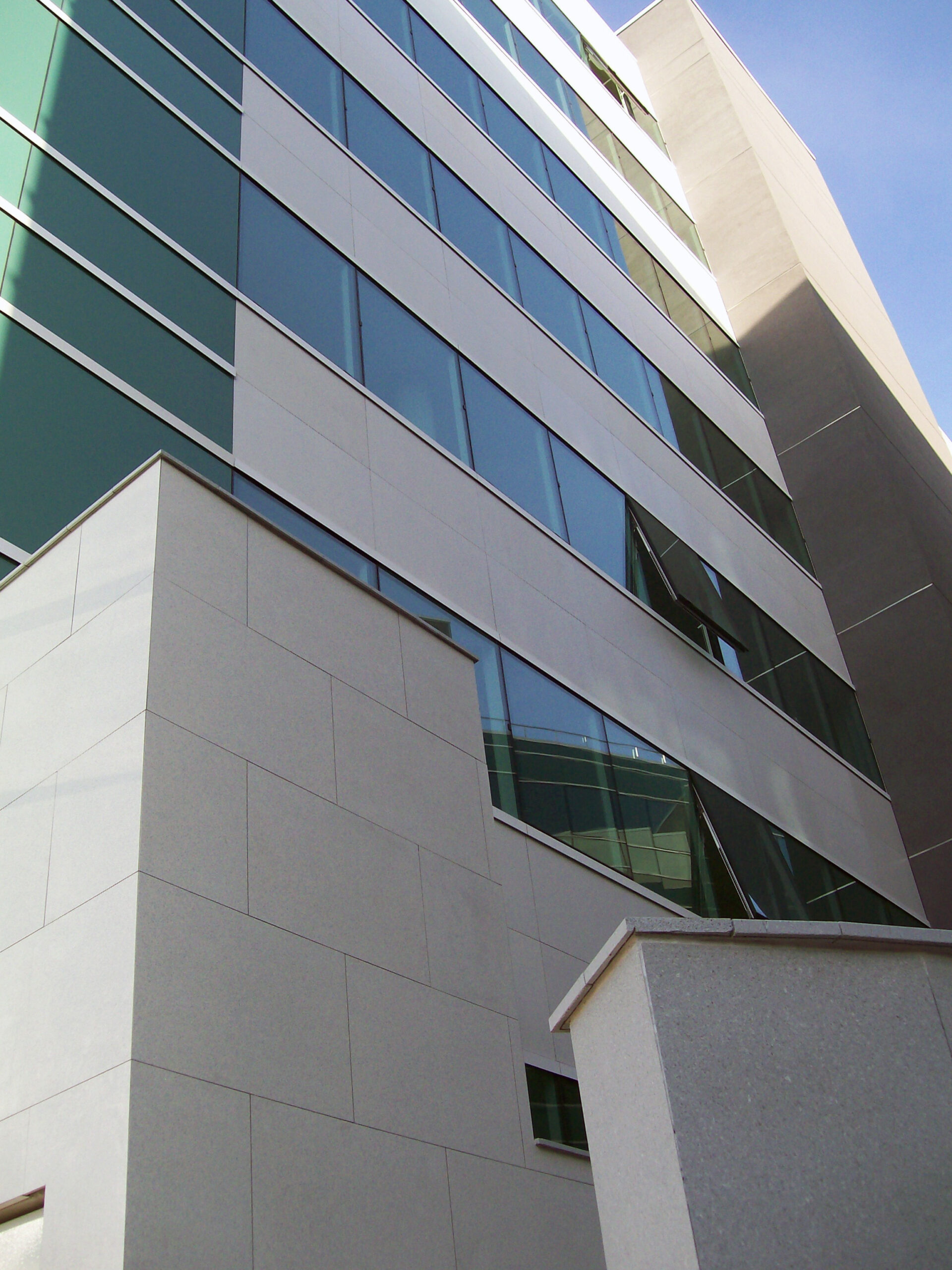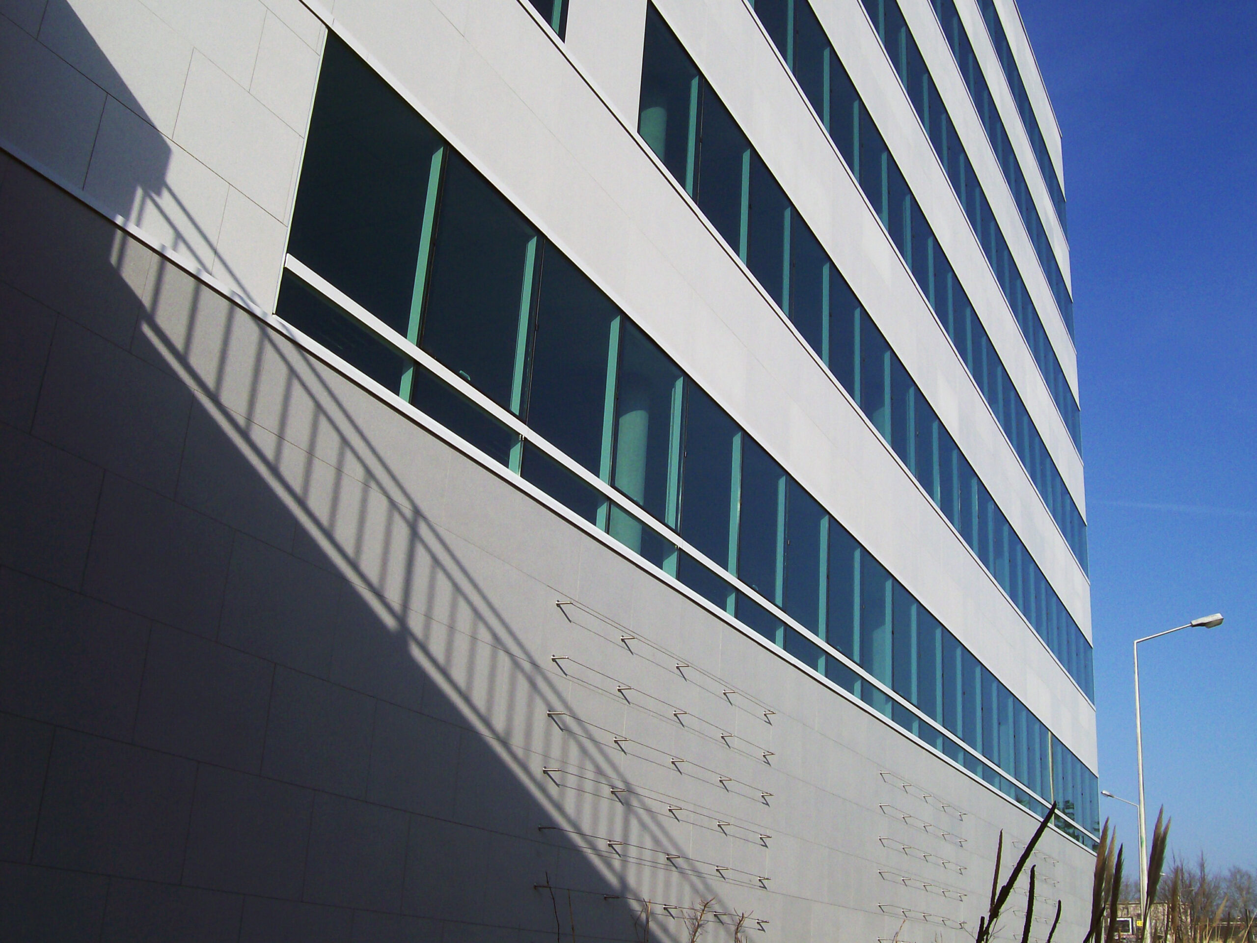 Die Fassade dieses Bürogebäudes wurde mit mineralischen Fassadenverkleidungen gebaut: LISSE VELOUTÉ von Carea. Sie wurden als Teil einer Vorhangfassade verwendet. In den unteren Bereichen wurde eine dickere Verblendung (21 mm) verwendet, wodurch die Unterkonstruktion verstärkt wurde. Diese Verblendung ist nicht nur stoßfest, sondern aufgrund ihrer mineralischen Beschaffenheit auch nicht porös: Sie ist resistent gegen Graffiti und reduziert somit die zukünftigen Wartungskosten.
