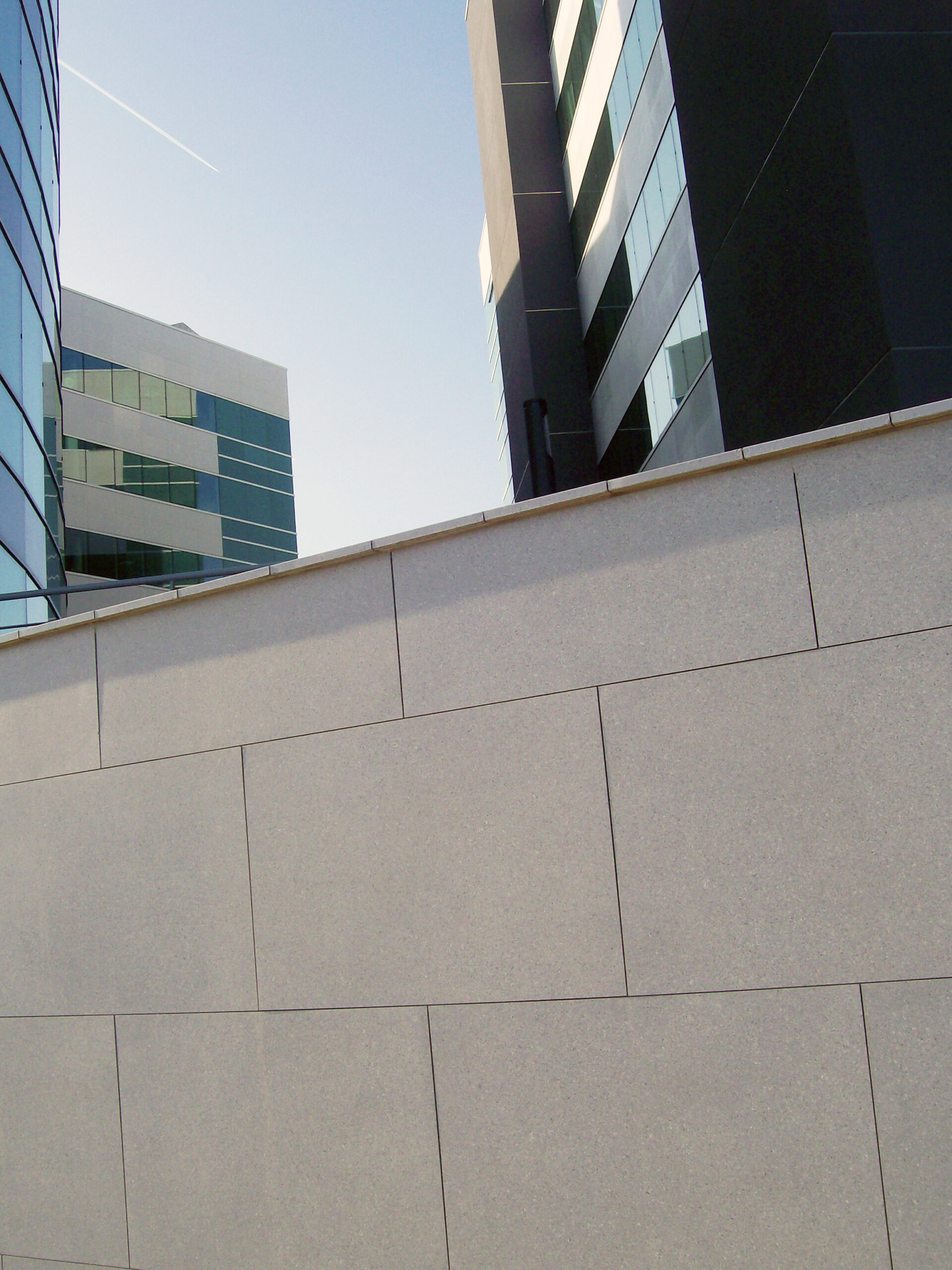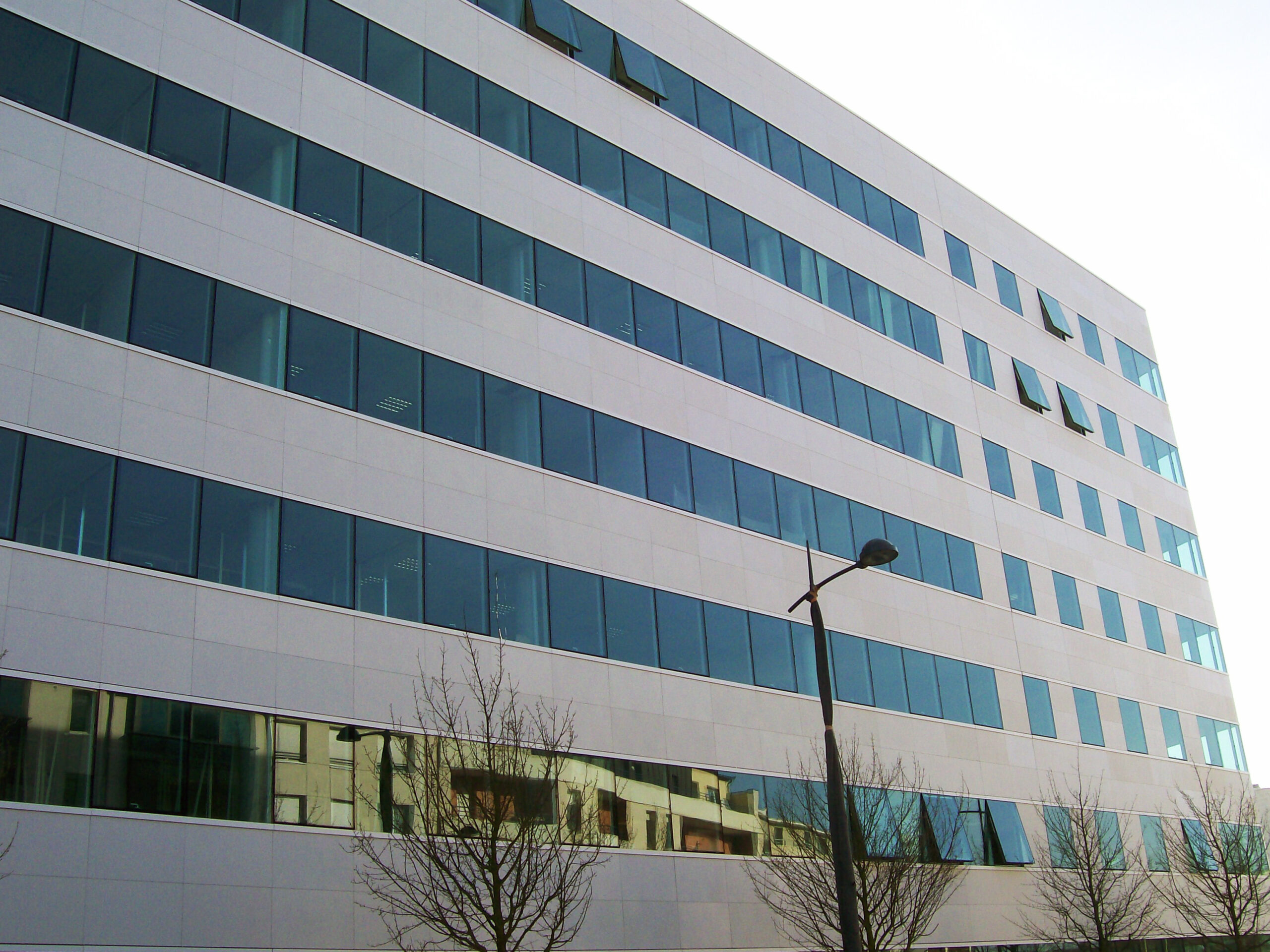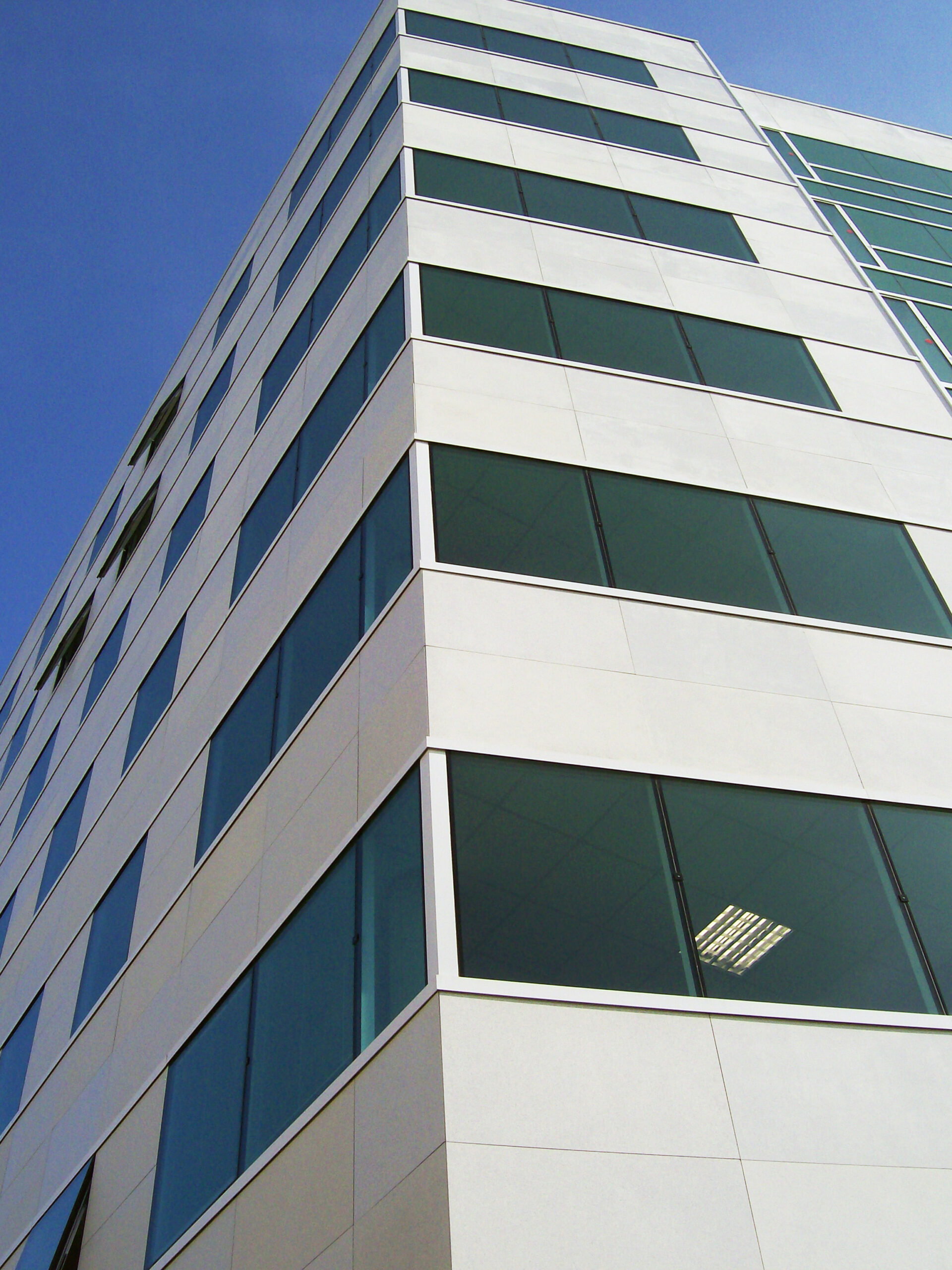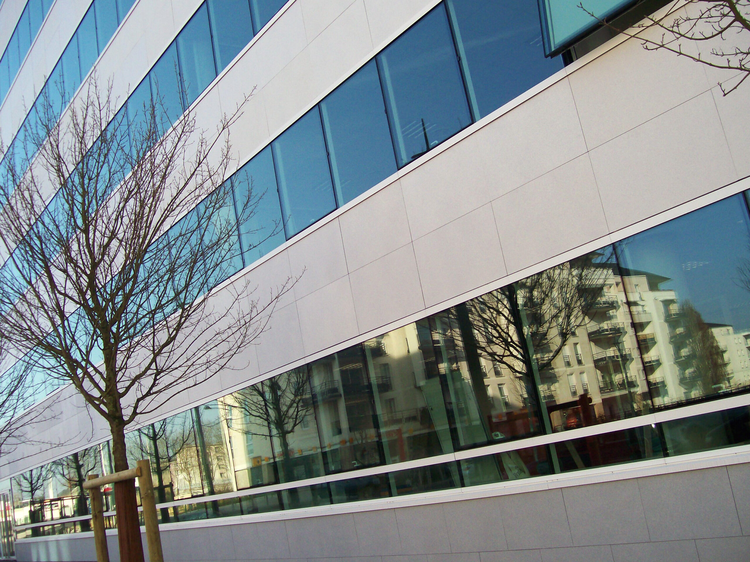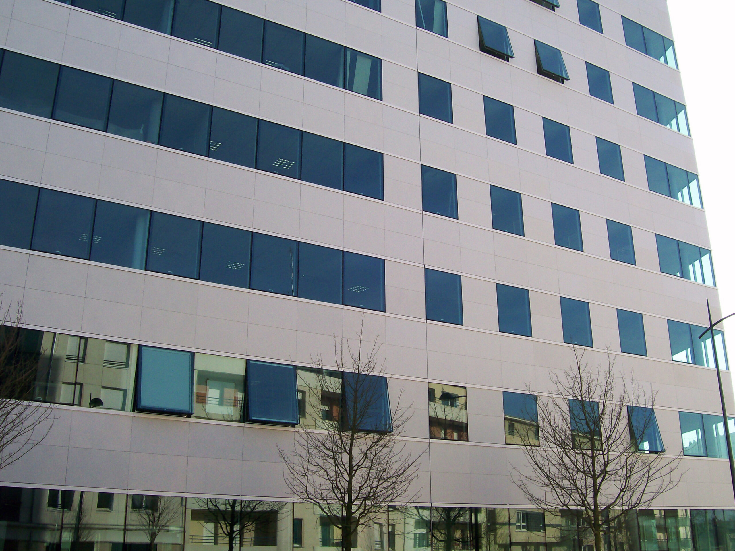 Die Fassade dieses Bürogebäudes wurde mit mineralischen Fassadenverkleidungen gebaut: LISSE VELOUTÉ von Carea. Sie wurden als Teil einer Vorhangfassade verwendet. In den unteren Bereichen wurde eine dickere Verblendung (21 mm) verwendet, wodurch die Unterkonstruktion verstärkt wurde. Diese Verblendung ist nicht nur stoßfest, sondern aufgrund ihrer mineralischen Beschaffenheit auch nicht porös: Sie ist resistent gegen Graffiti und reduziert somit die zukünftigen Wartungskosten.