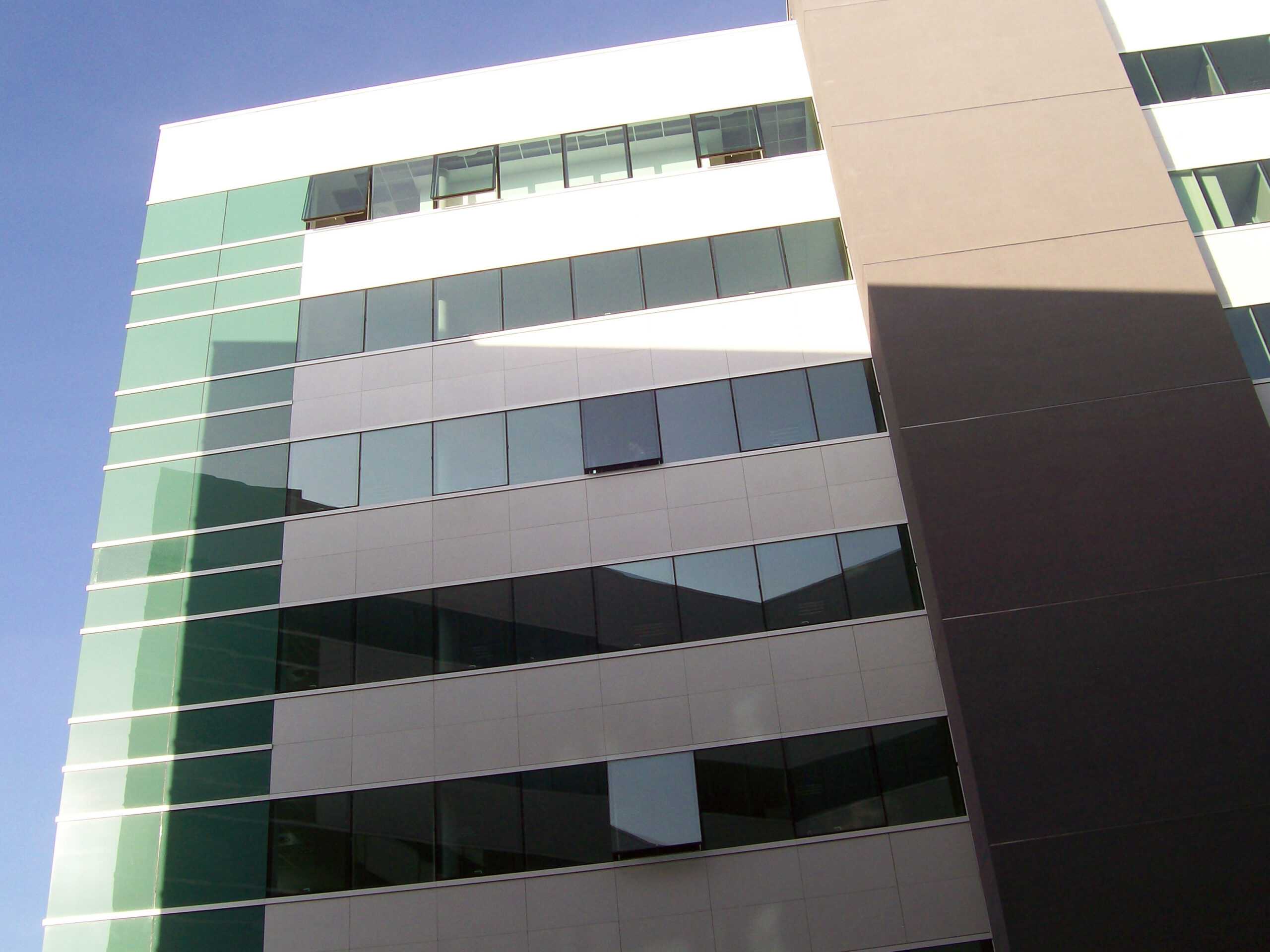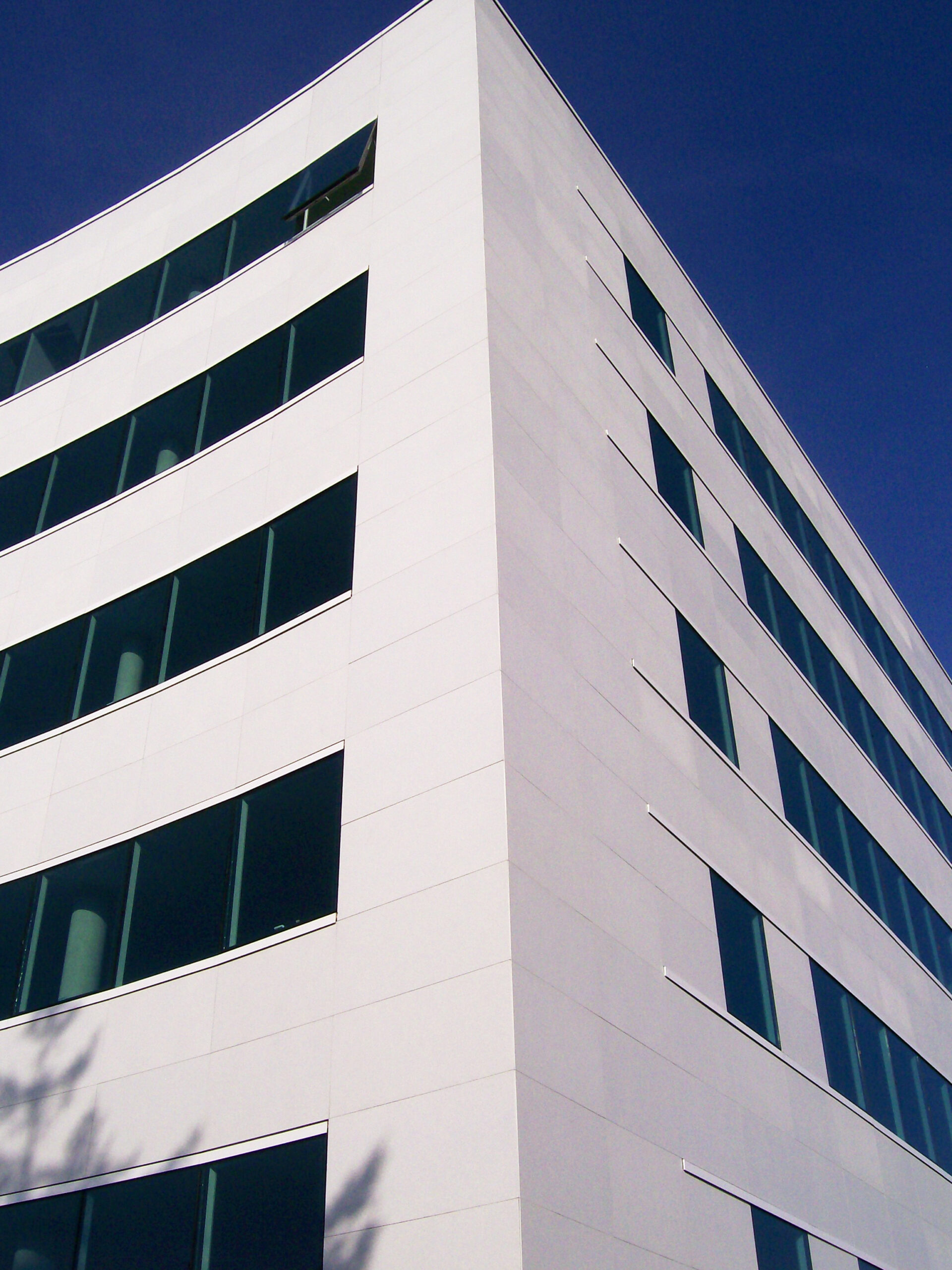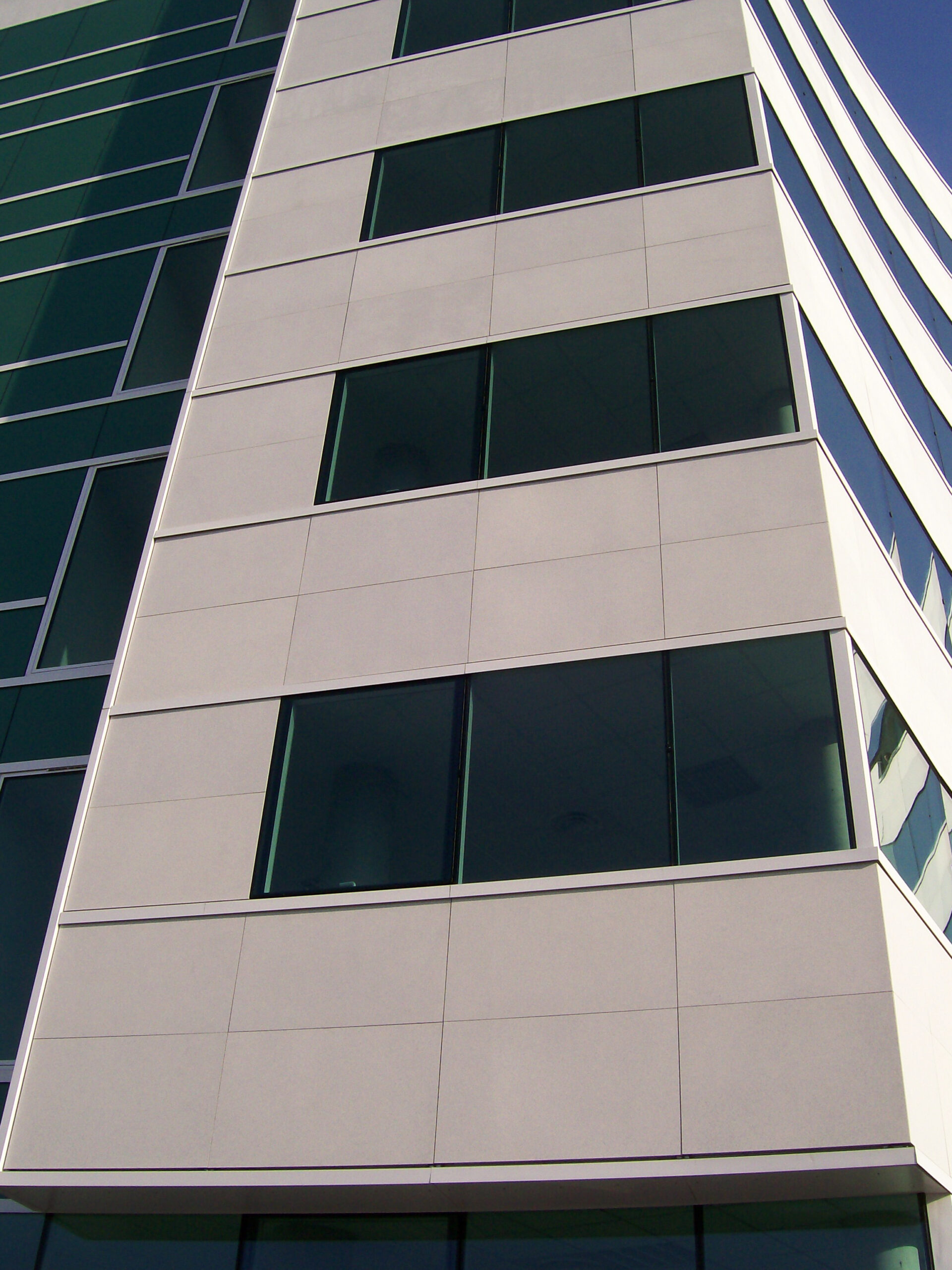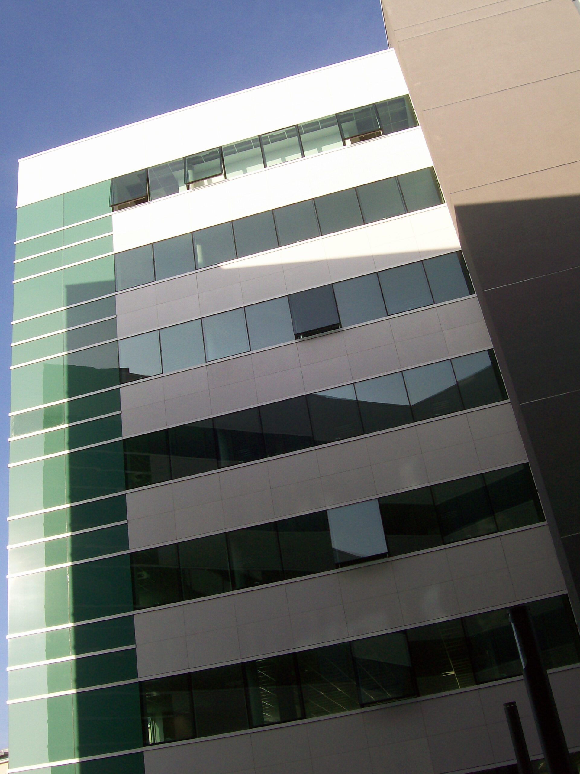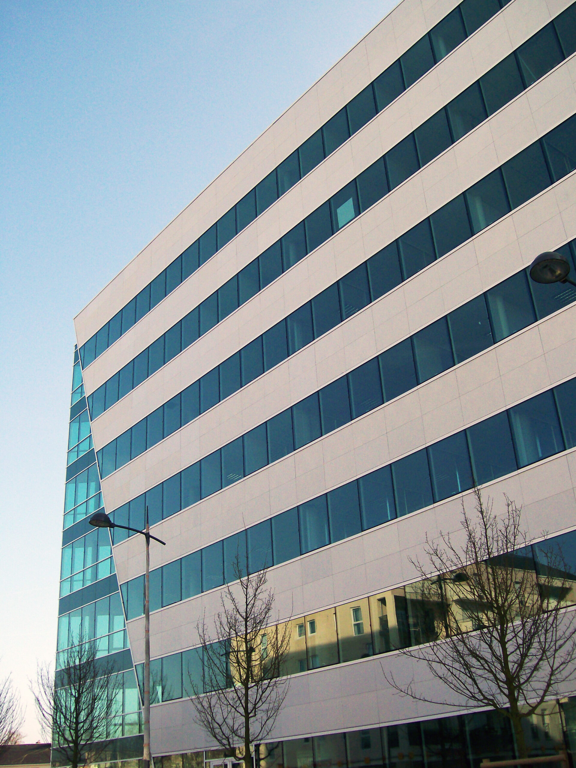 Die Fassade dieses Bürogebäudes wurde mit mineralischen Fassadenverkleidungen gebaut: LISSE VELOUTÉ von Carea. Sie wurden als Teil einer Vorhangfassade verwendet. In den unteren Bereichen wurde eine dickere Verblendung (21 mm) verwendet, wodurch die Unterkonstruktion verstärkt wurde. Diese Verblendung ist nicht nur stoßfest, sondern aufgrund ihrer mineralischen Beschaffenheit auch nicht porös: Sie ist resistent gegen Graffiti und reduziert somit die zukünftigen Wartungskosten.