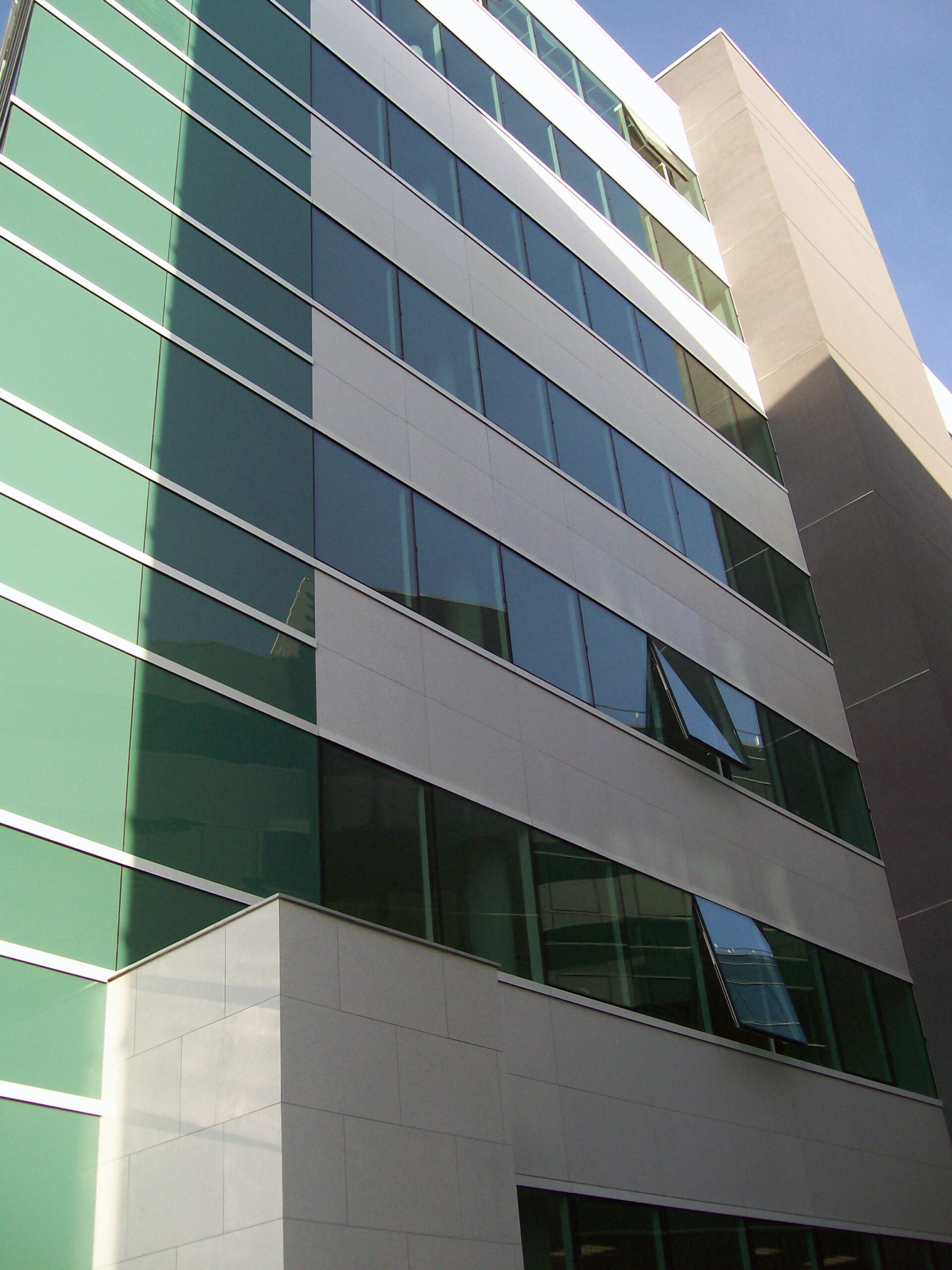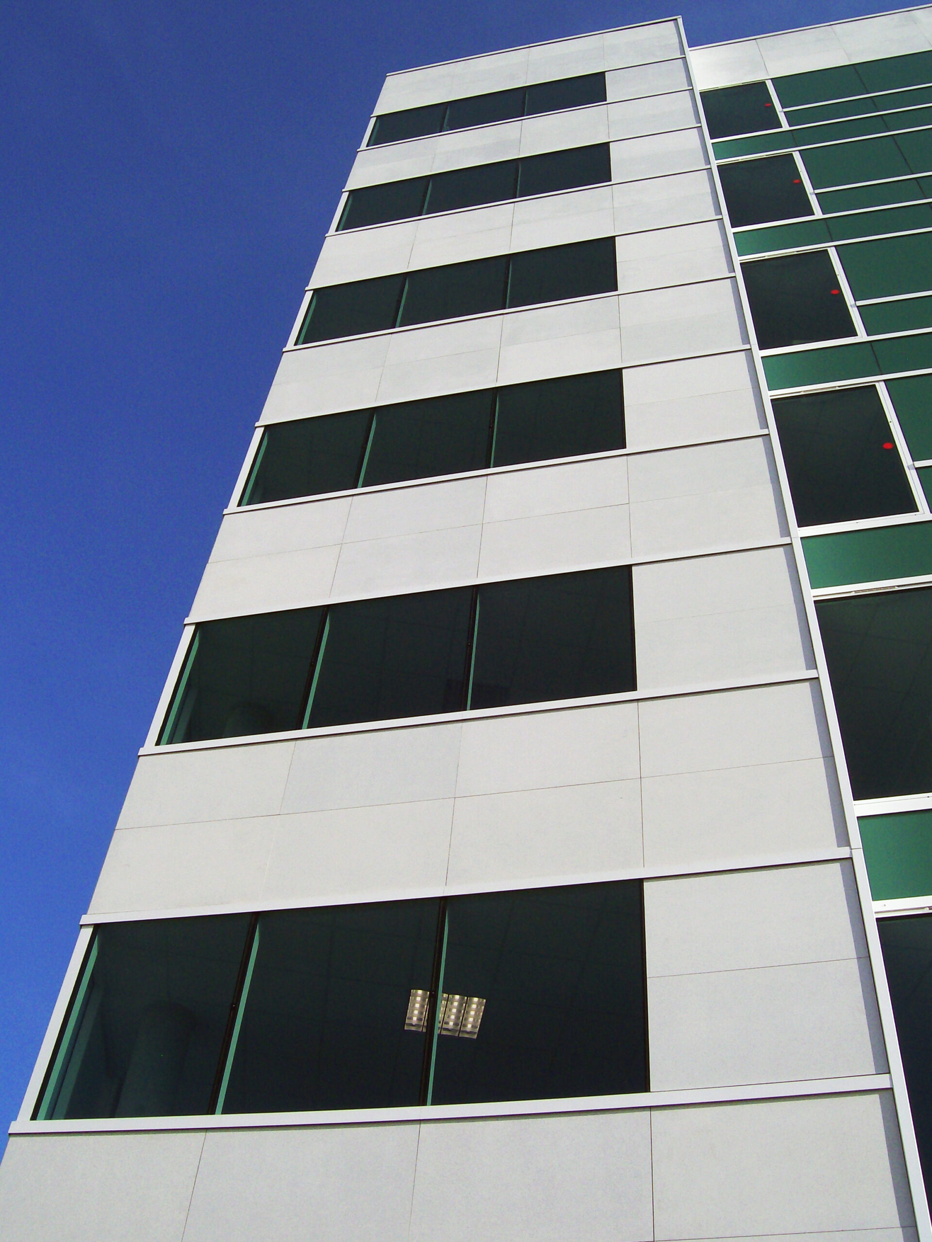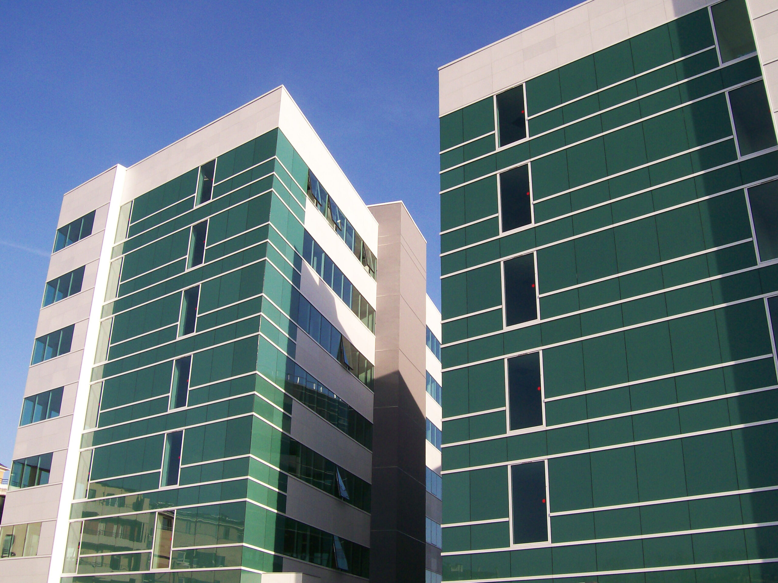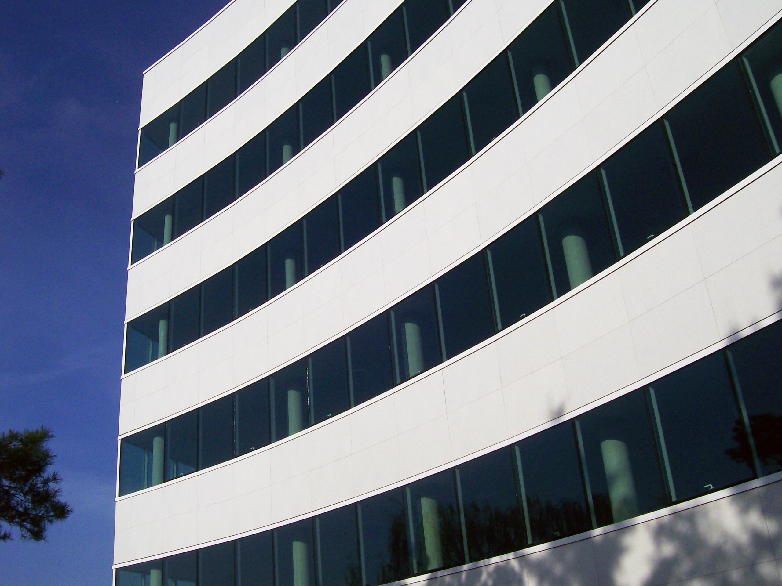 Die Fassade dieses Bürogebäudes wurde mit mineralischen Fassadenverkleidungen gebaut: LISSE VELOUTÉ von Carea. Sie wurden als Teil einer Vorhangfassade verwendet. In den unteren Bereichen wurde eine dickere Verblendung (21 mm) verwendet, wodurch die Unterkonstruktion verstärkt wurde. Diese Verblendung ist nicht nur stoßfest, sondern aufgrund ihrer mineralischen Beschaffenheit auch nicht porös: Sie ist resistent gegen Graffiti und reduziert somit die zukünftigen Wartungskosten.