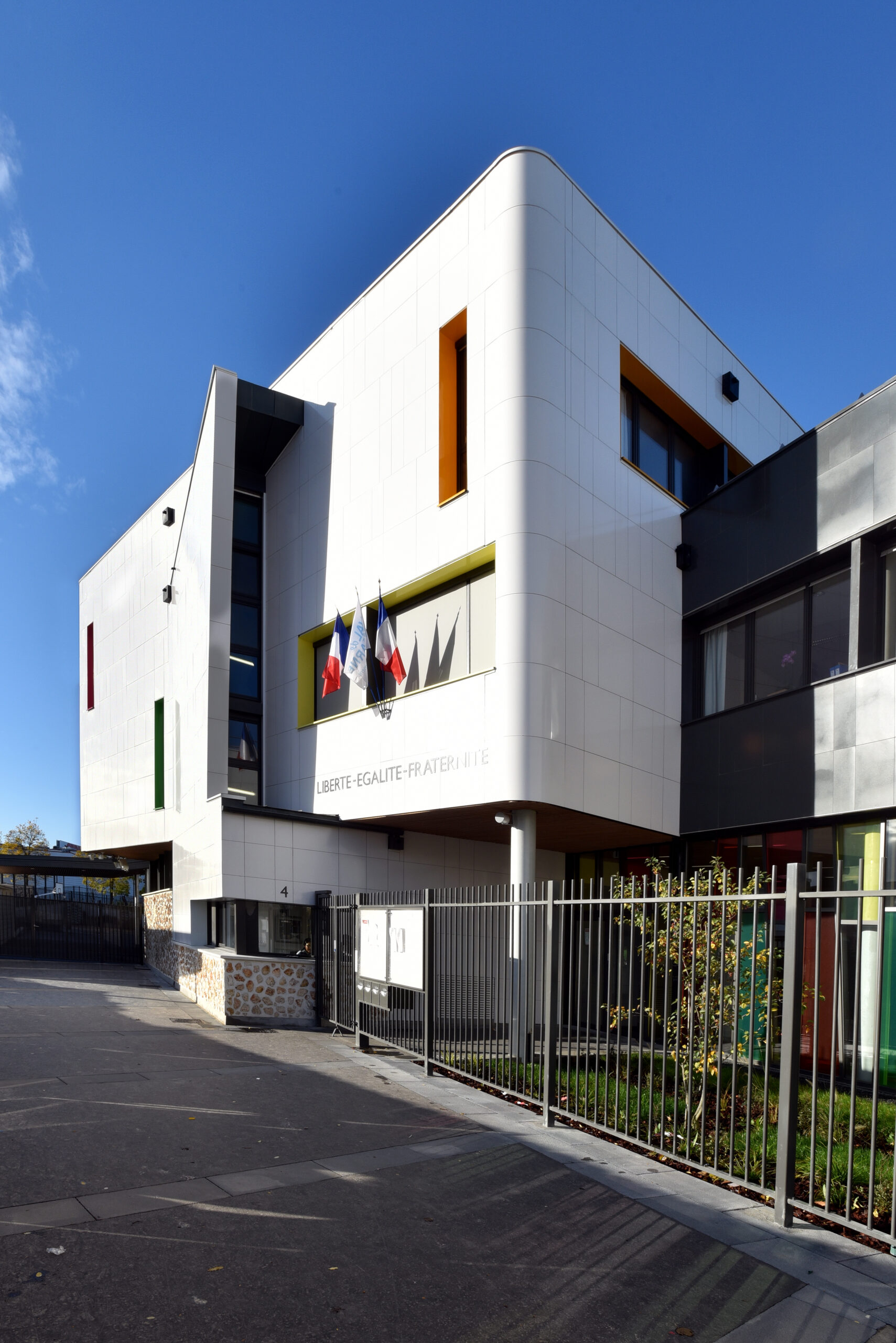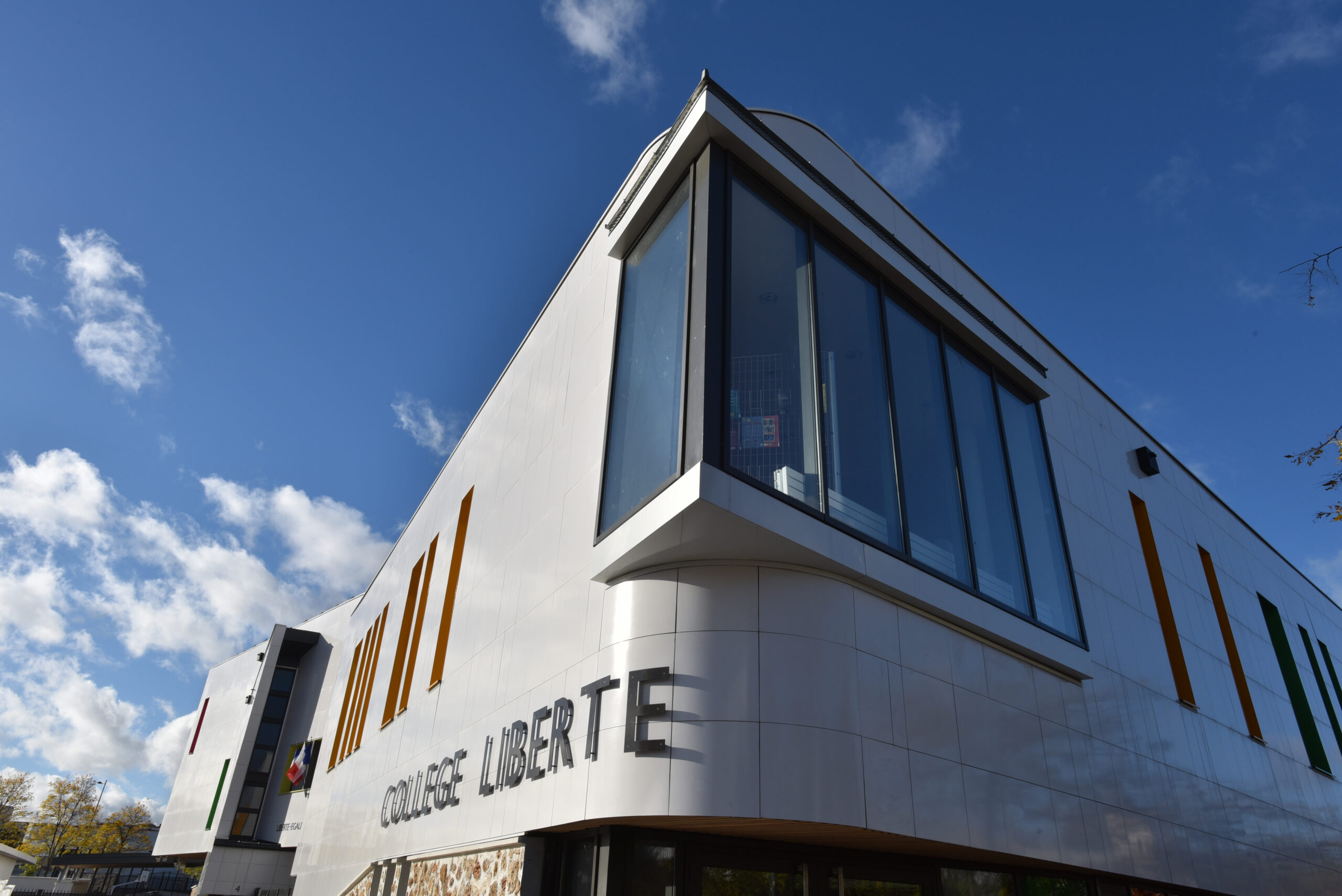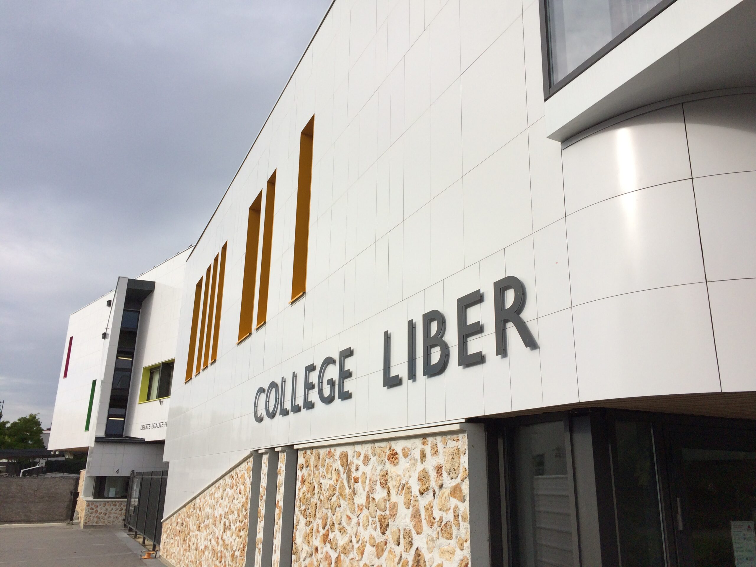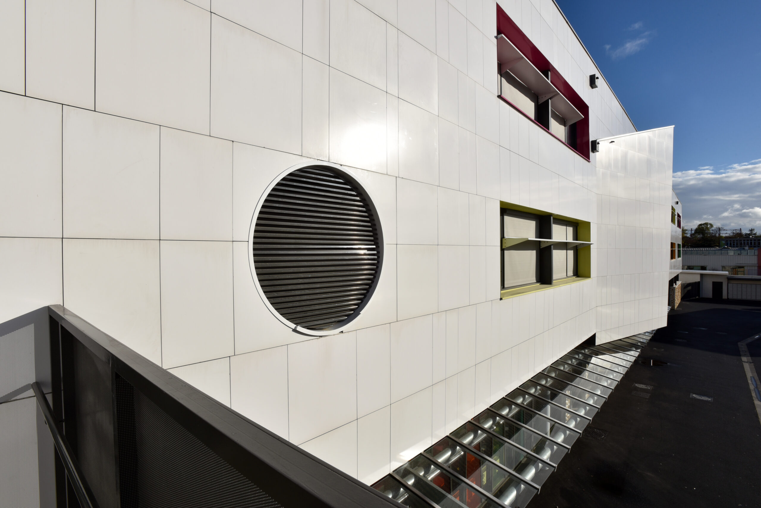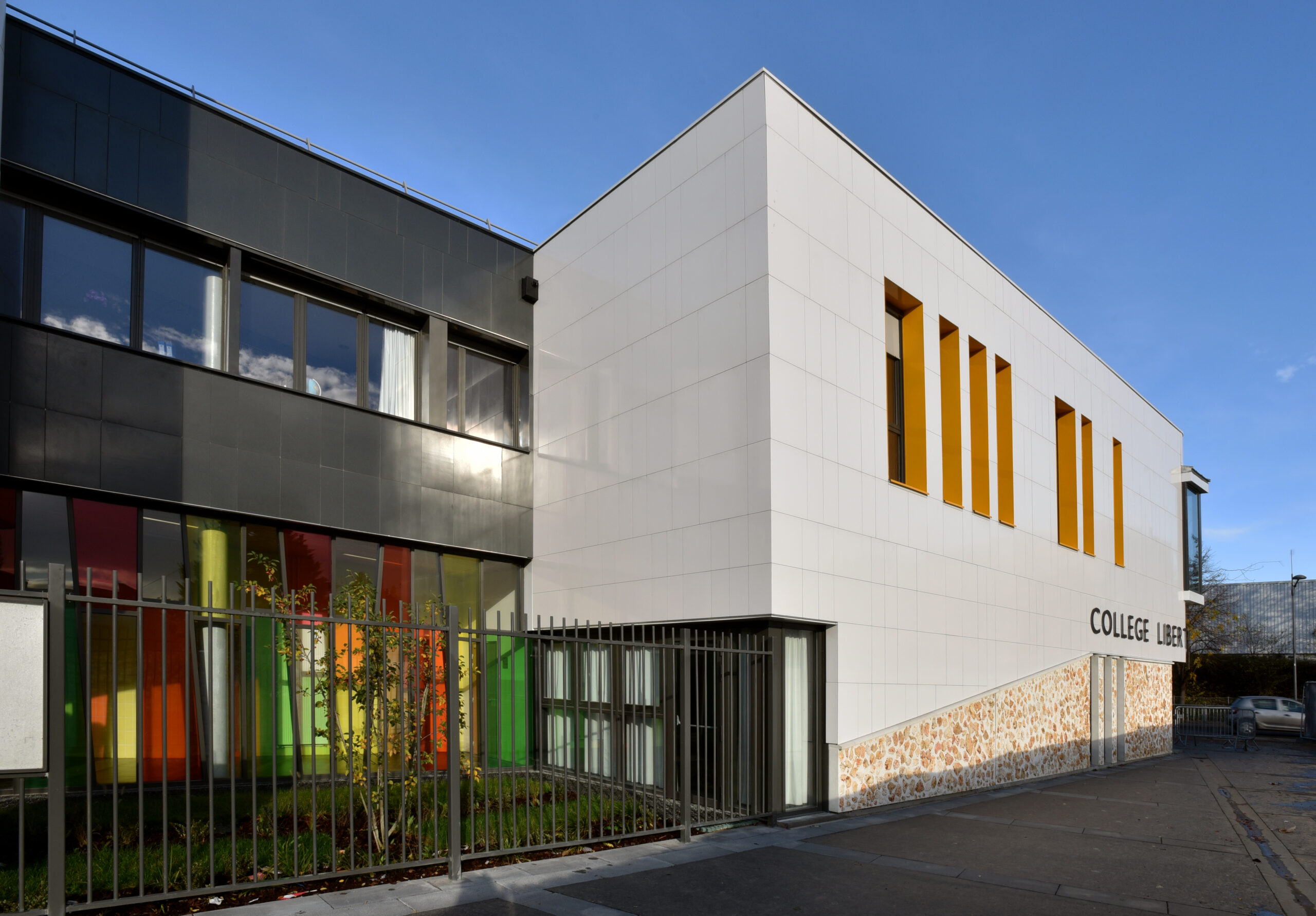 Das Collège Liberté in Chevilly-Larue wurde mit den Fassadenverkleidungen LISSE BRILLANT und PAPYRUS (zerknittertes Papier) verkleidet, die hier als Fassadenverkleidung mit Unterkonstruktion (BAO) verwendet wurden.