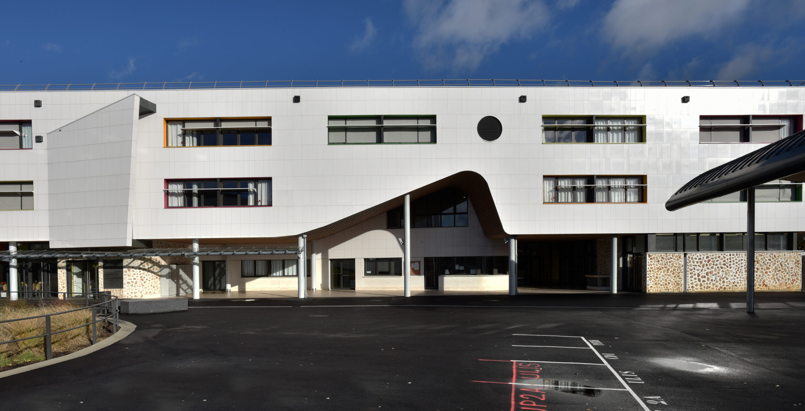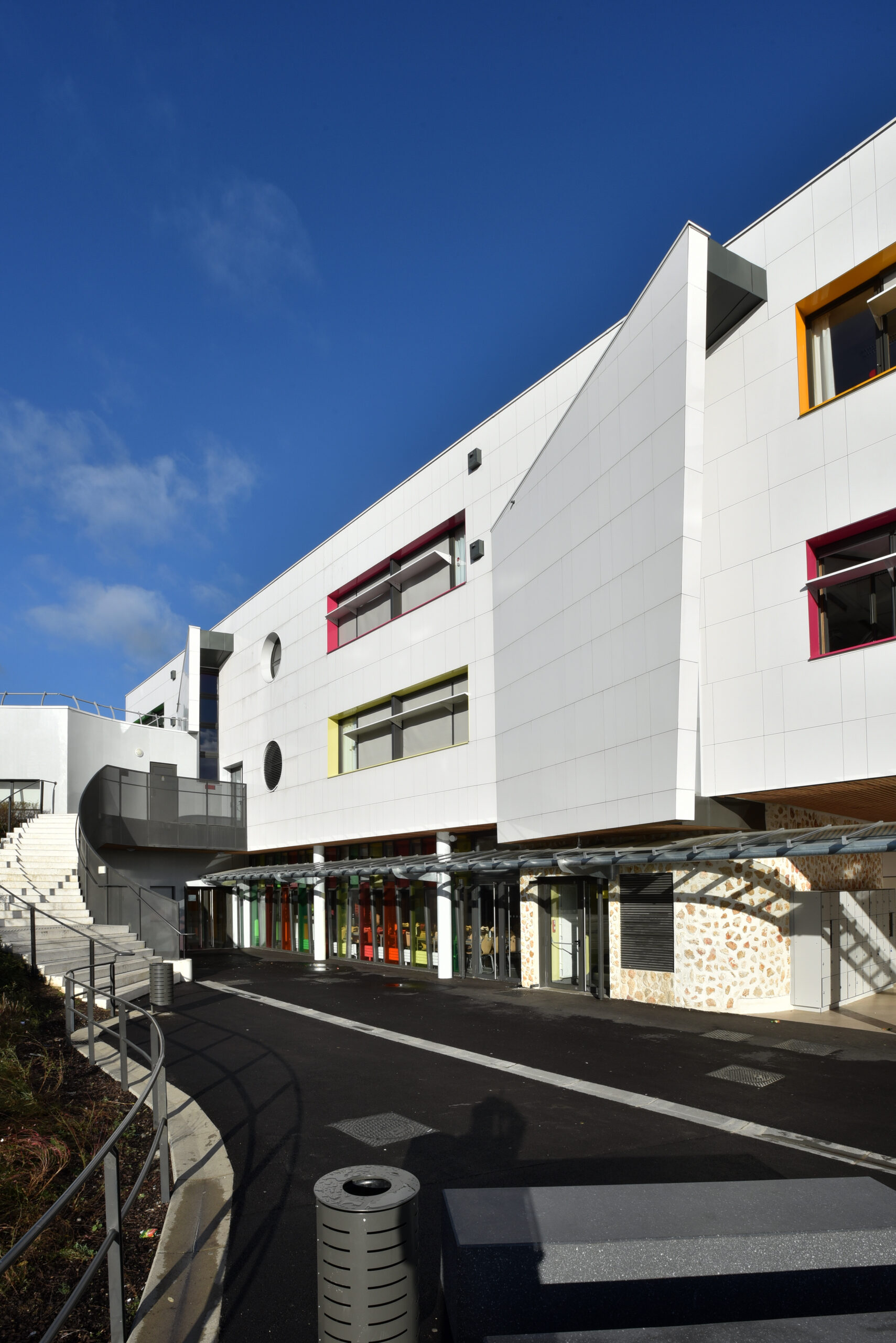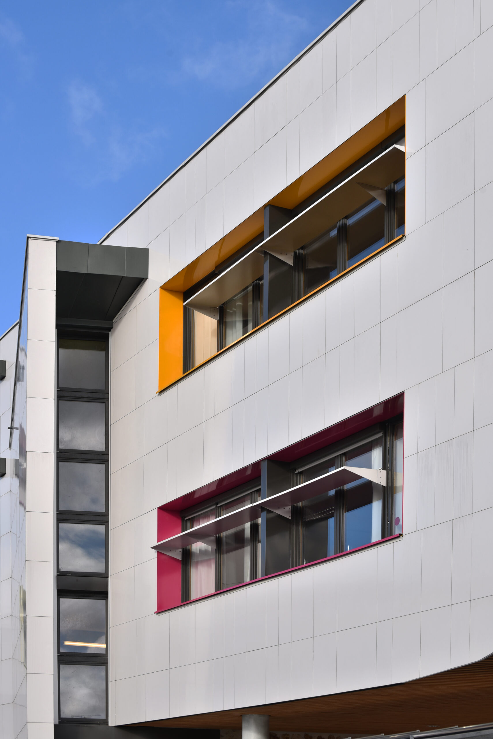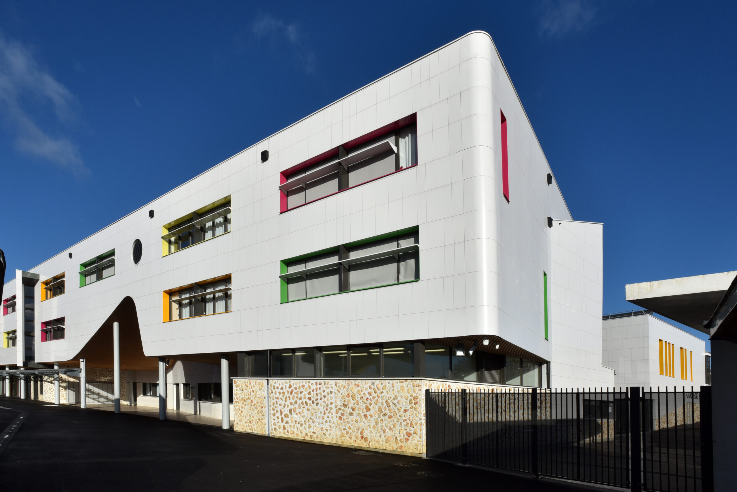 Das Collège Liberté in Chevilly-Larue wurde mit den Fassadenverkleidungen LISSE BRILLANT und PAPYRUS (zerknittertes Papier) verkleidet, die hier als Fassadenverkleidung mit Unterkonstruktion (BAO) verwendet wurden.