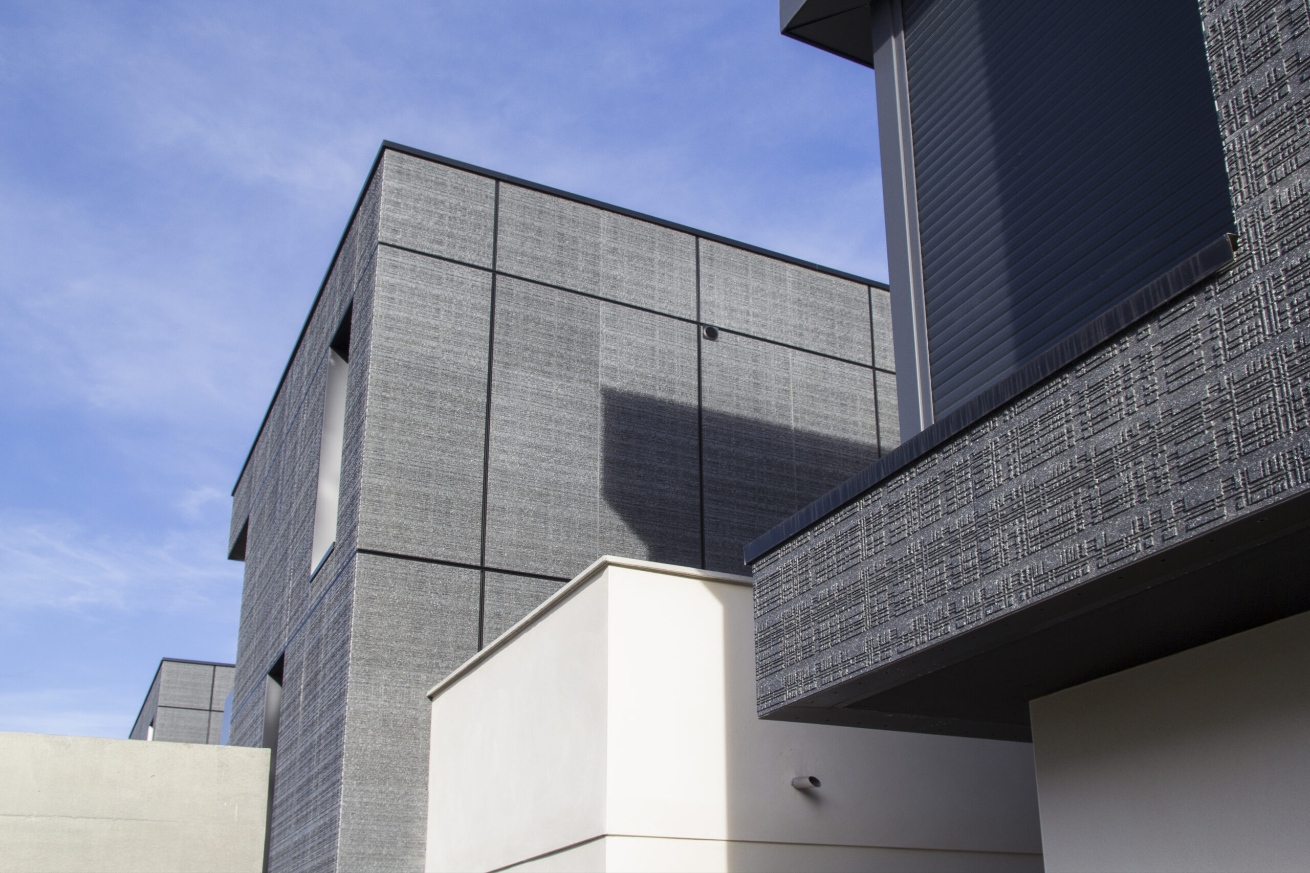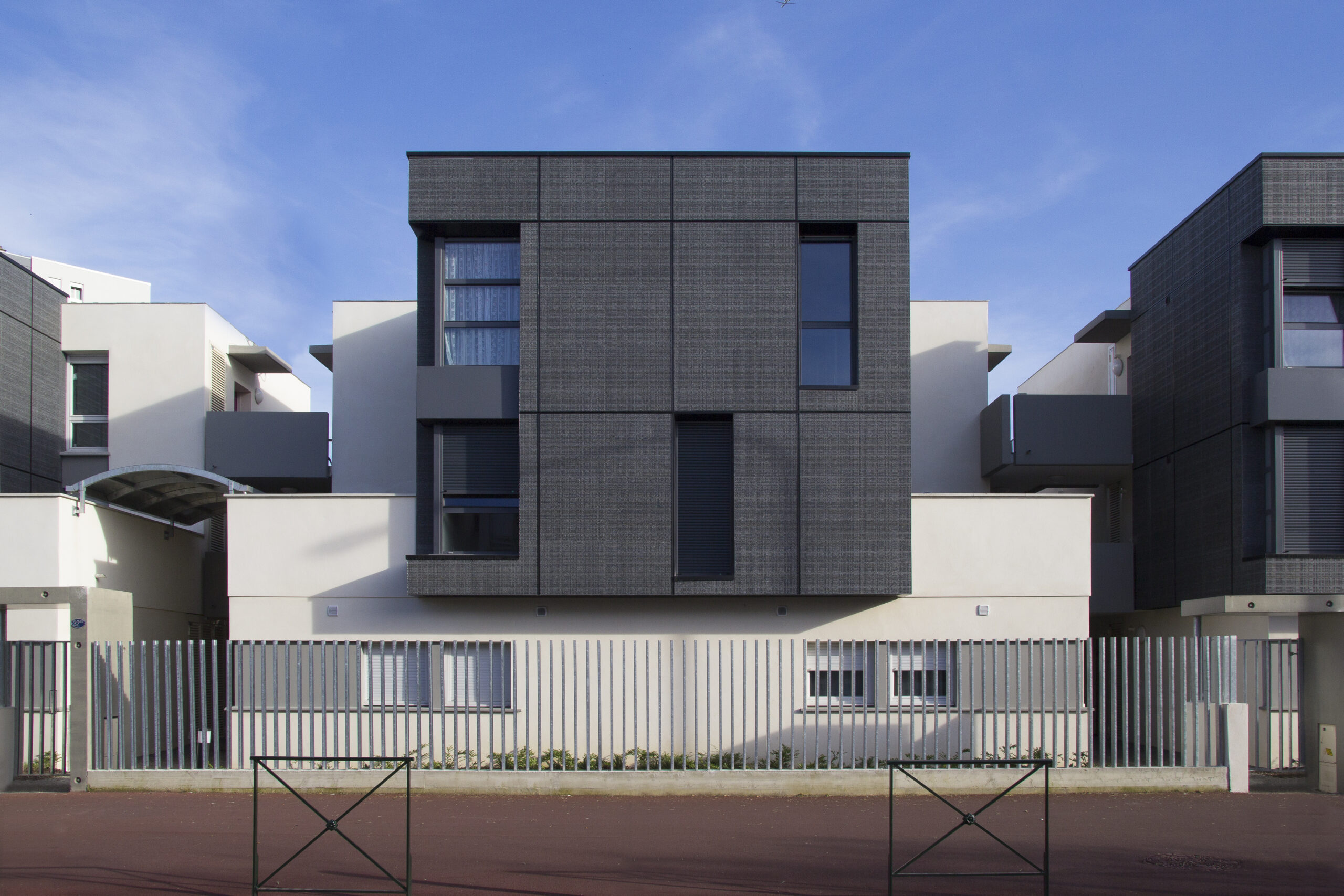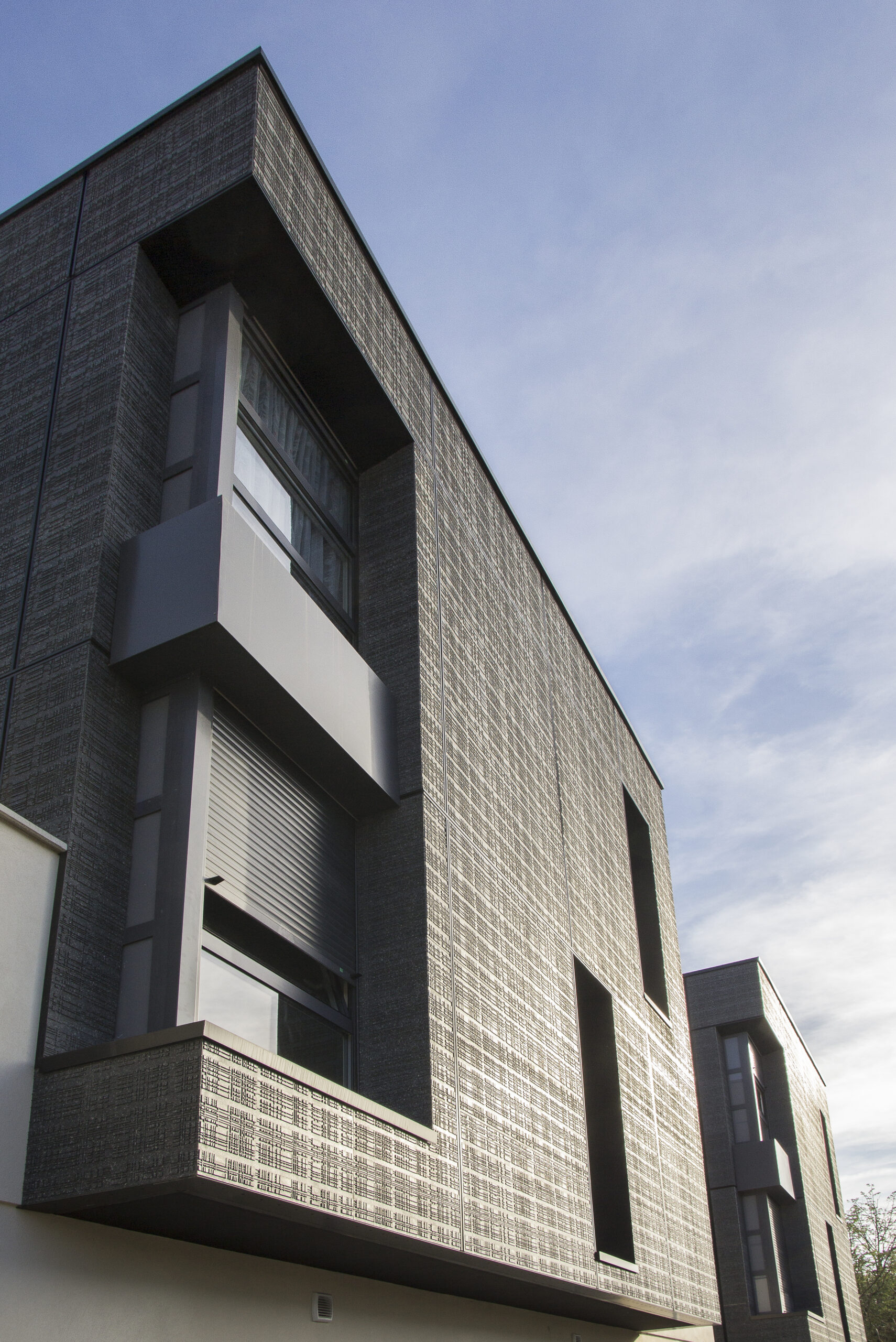 Die Fassade dieser Residenz verwendet die mineralischen Fassadenplatten von Carea in der URBA-Optik, die hier mit dem BAO-System (Bardage with Framework) eingesetzt wurden. Das Verlegemuster dieser Fassade nutzt die Eigenschaften dieser Verblender, die ohne Fugen zusammengesetzt werden können und deren Muster dann kontinuierlich erscheint: 6 große Paneele werden gruppiert und geben dank des Verlegemusters und der geschickten Fugen zwischen den Sets die Illusion von sehr großformatigen Elementen.
