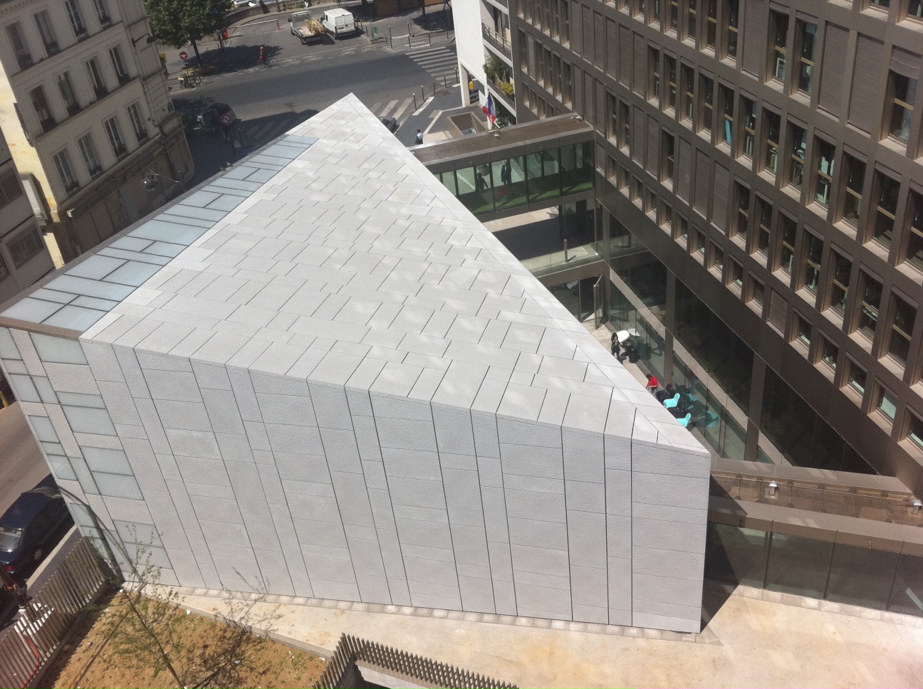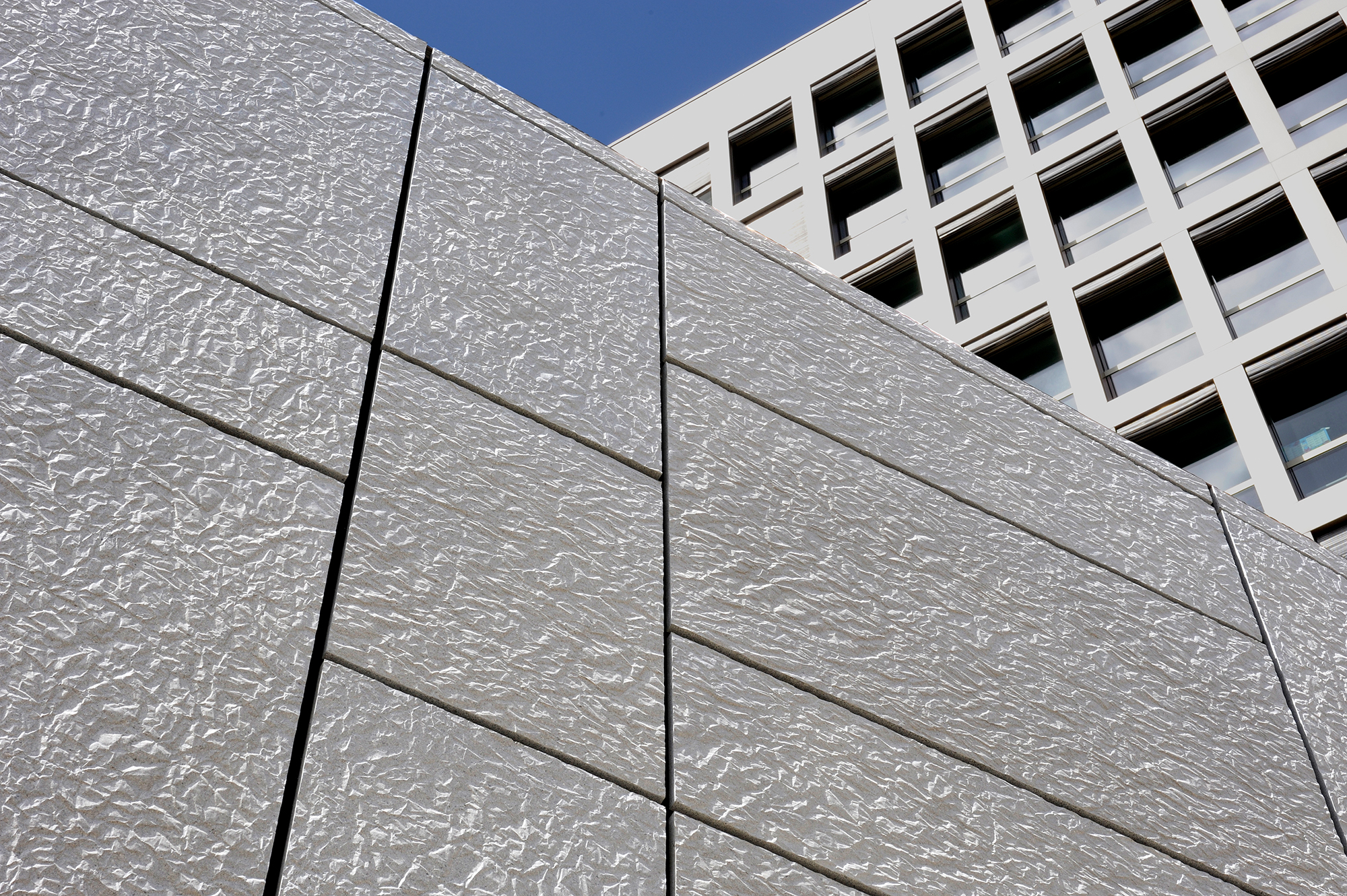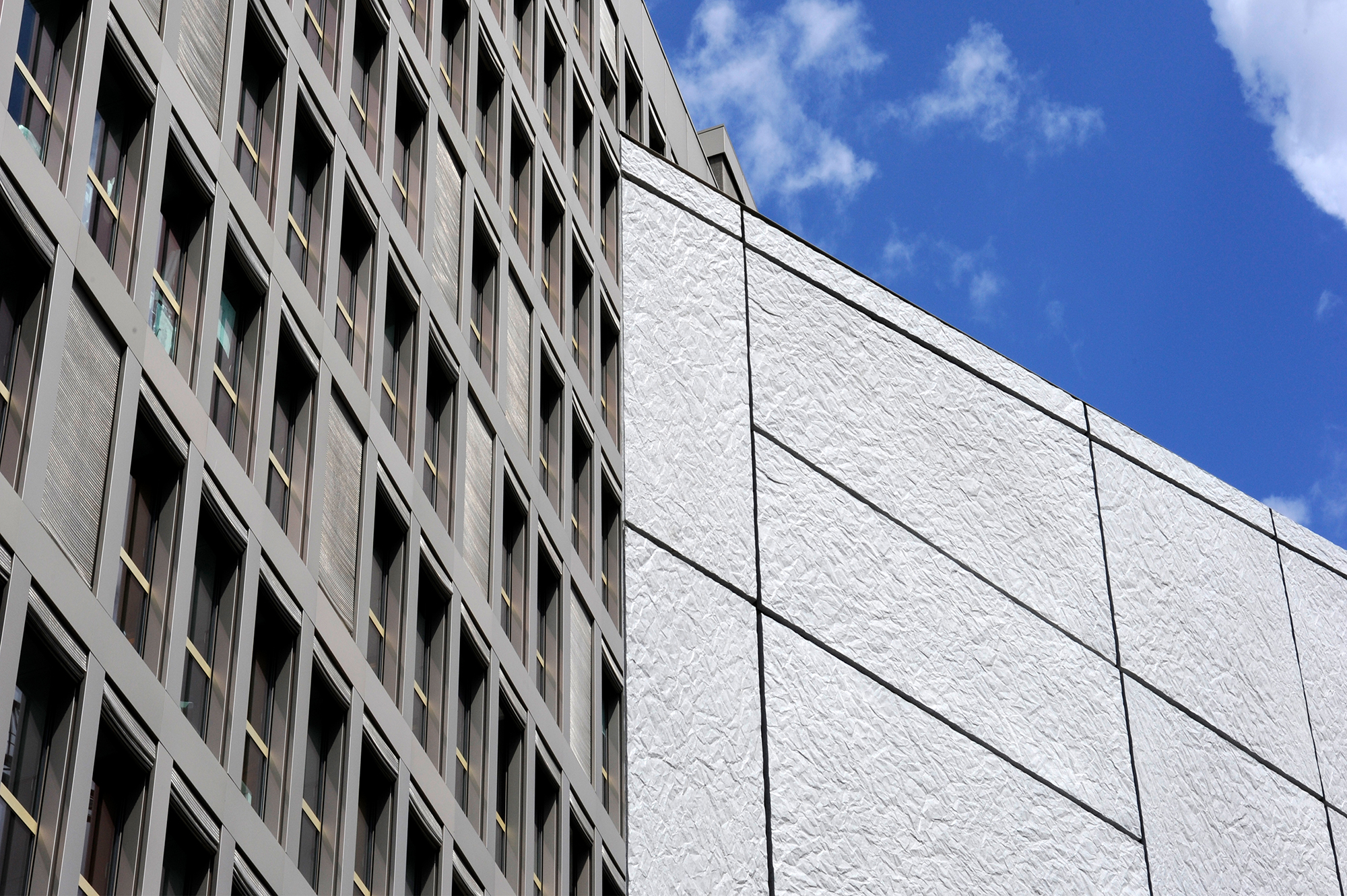 Bemerkenswert ist, dass sich diese Verkleidung bis zur Spitze des Gebäudes fortsetzt (Aufdach), was die Konzepte der Gebäudehülle oder der fünften Fassade perfekt veranschaulicht.