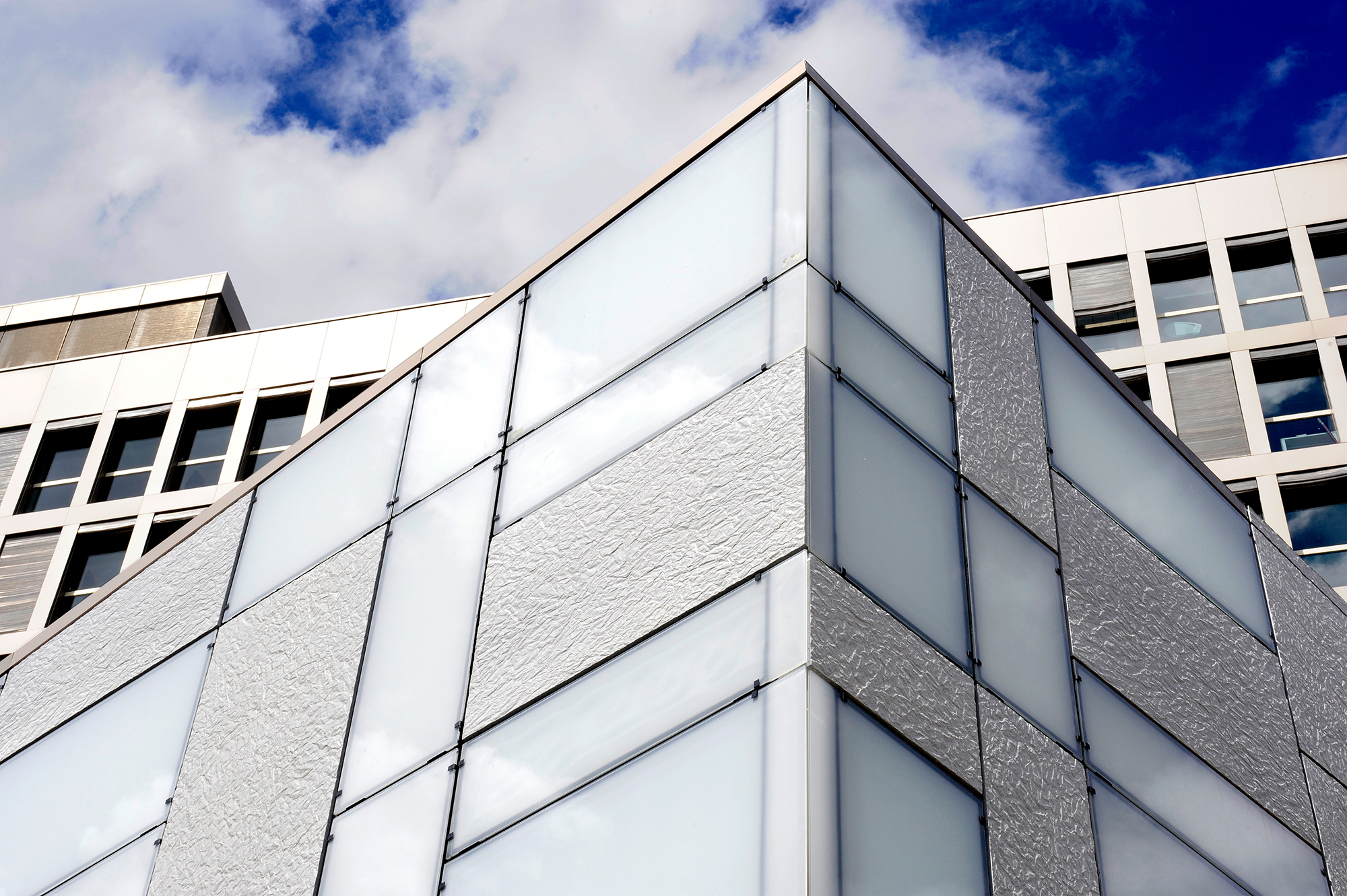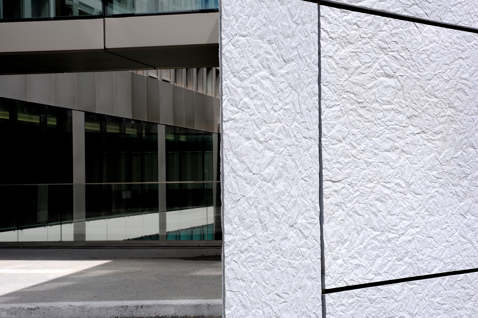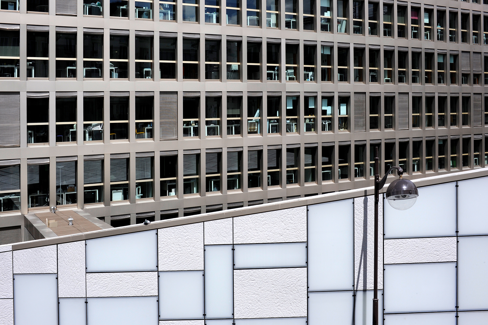 Bemerkenswert ist, dass sich diese Verkleidung bis zur Spitze des Gebäudes fortsetzt (Aufdach), was die Konzepte der Gebäudehülle oder der fünften Fassade perfekt veranschaulicht.