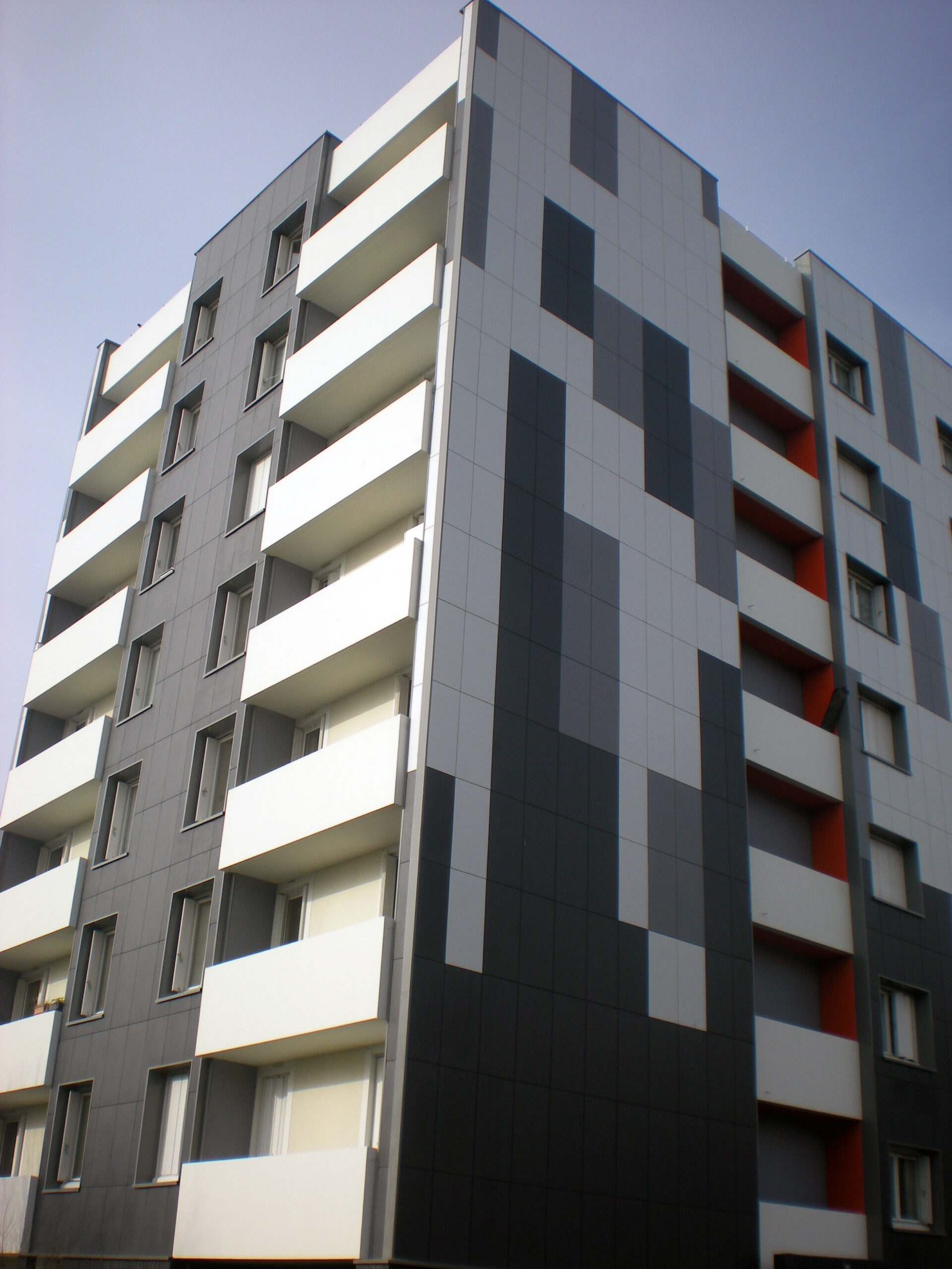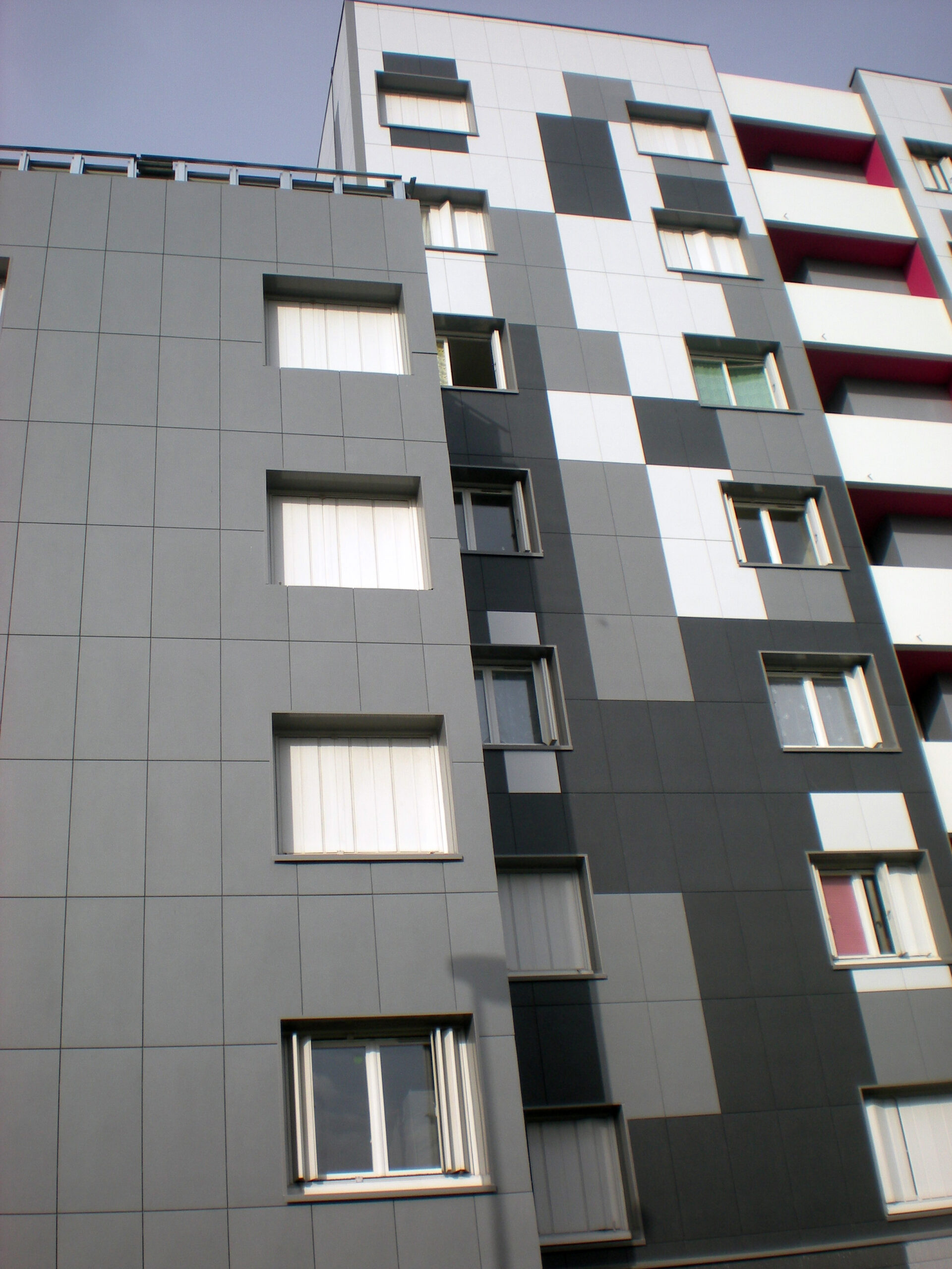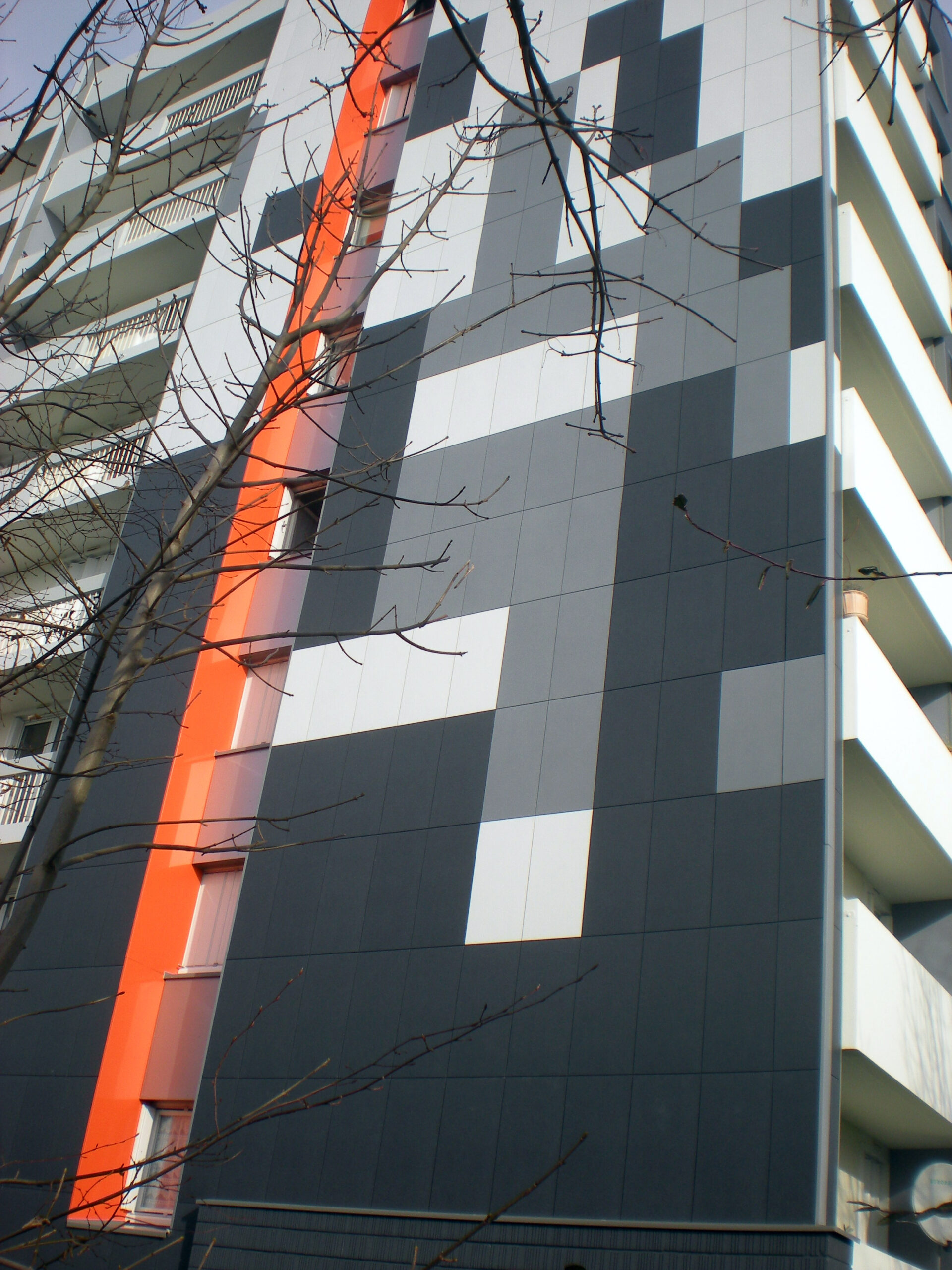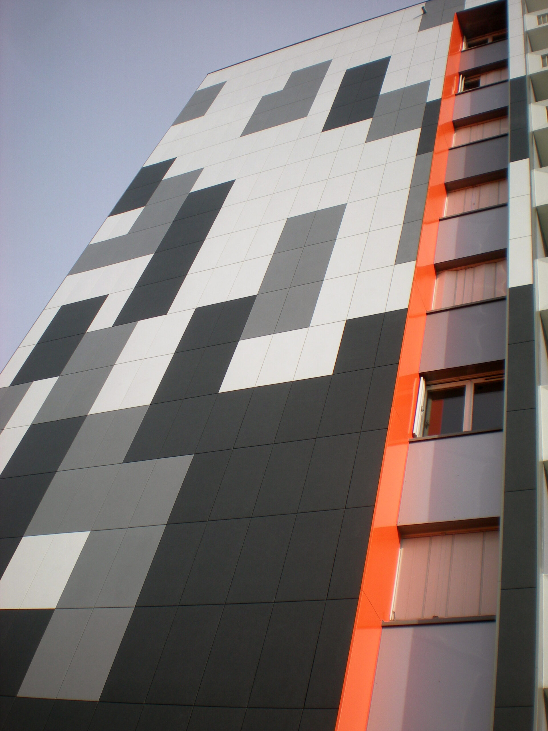 Carea frameless cladding in SMOOTH finish for this apartment building. White, light-grey and dark-grey claddings, plus some bright orange returns, enliven the mosaic-like facade.