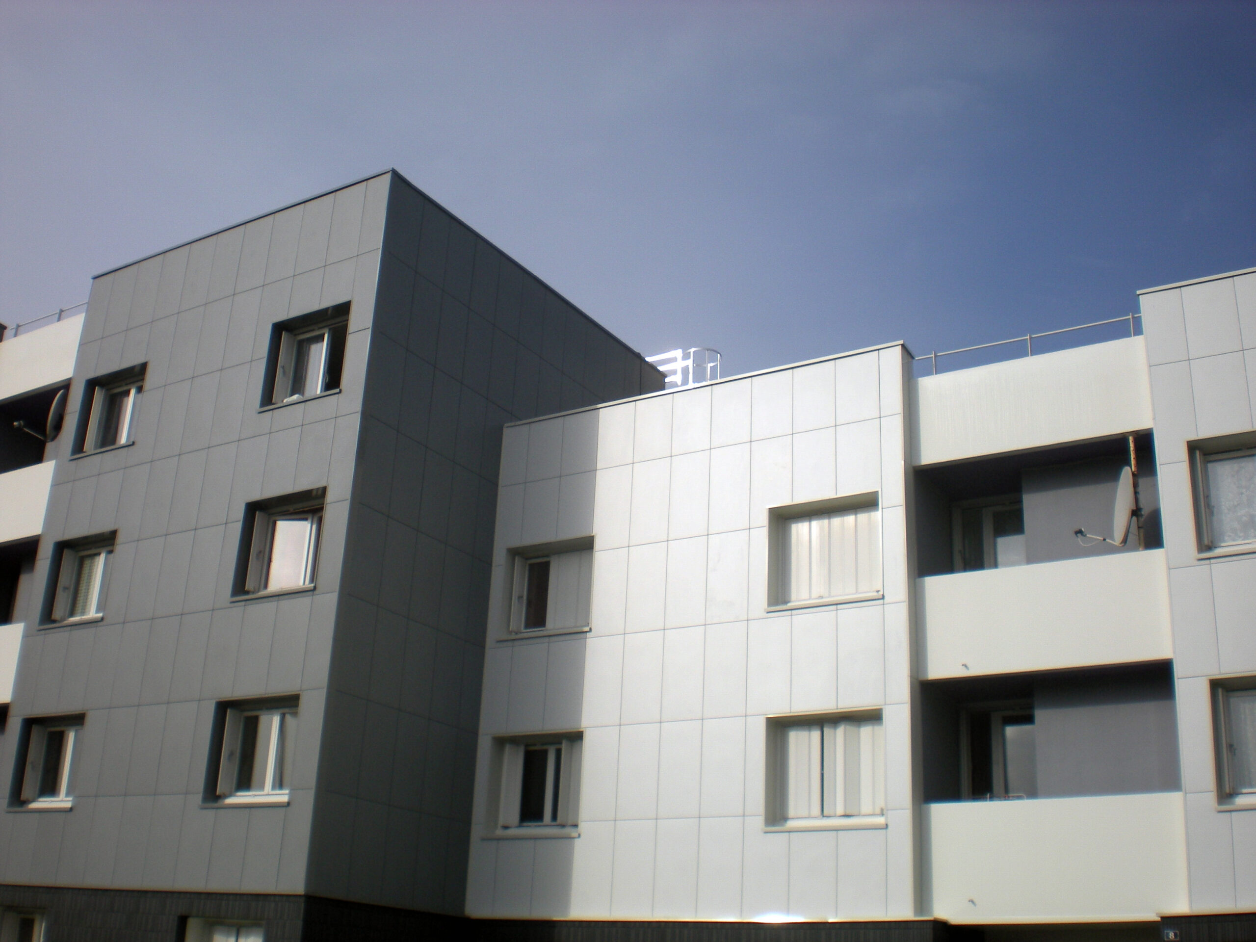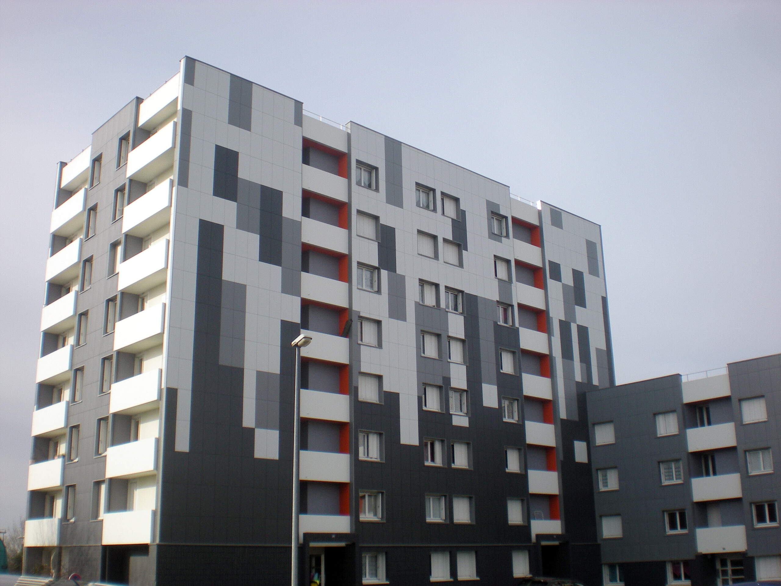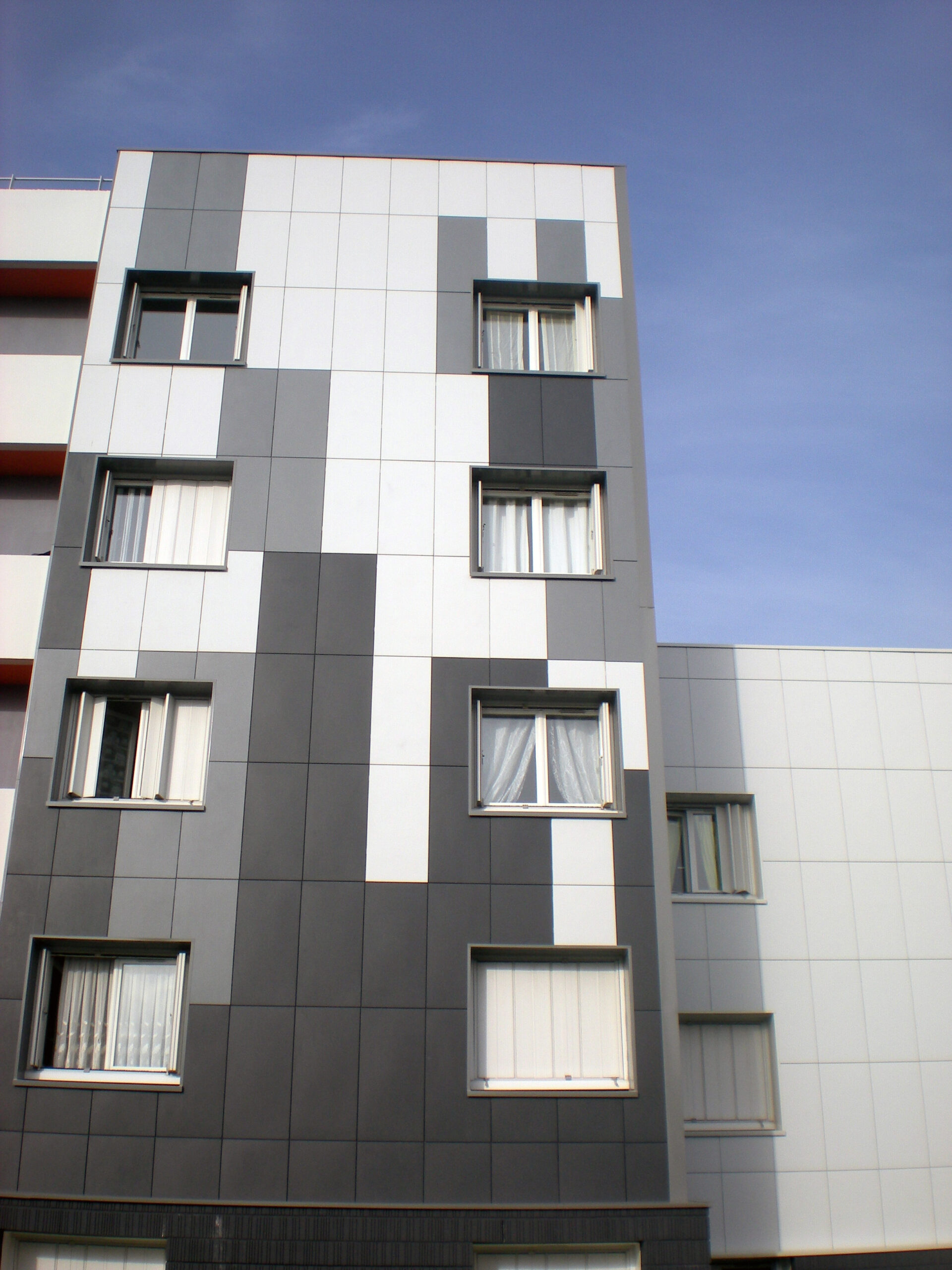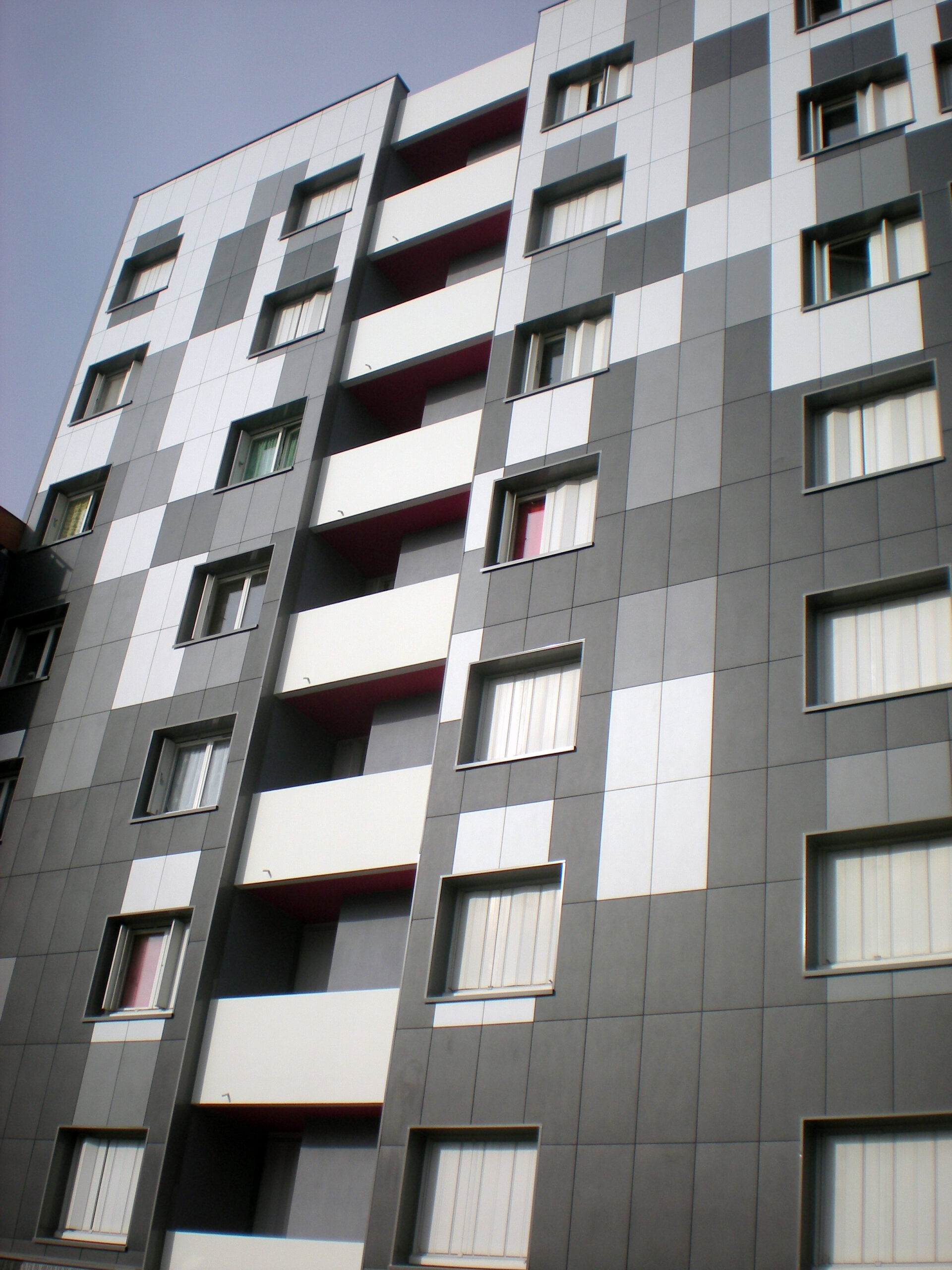 Carea frameless cladding in SMOOTH finish for this apartment building. White, light-grey and dark-grey claddings, plus some bright orange returns, enliven the mosaic-like facade.