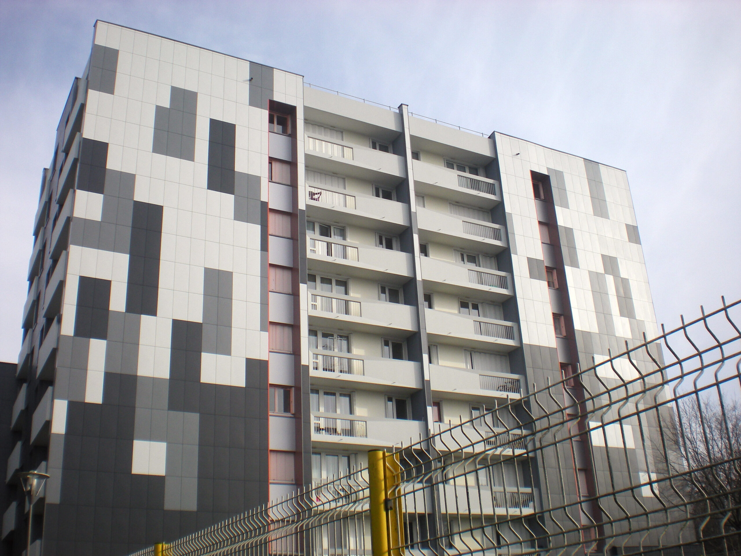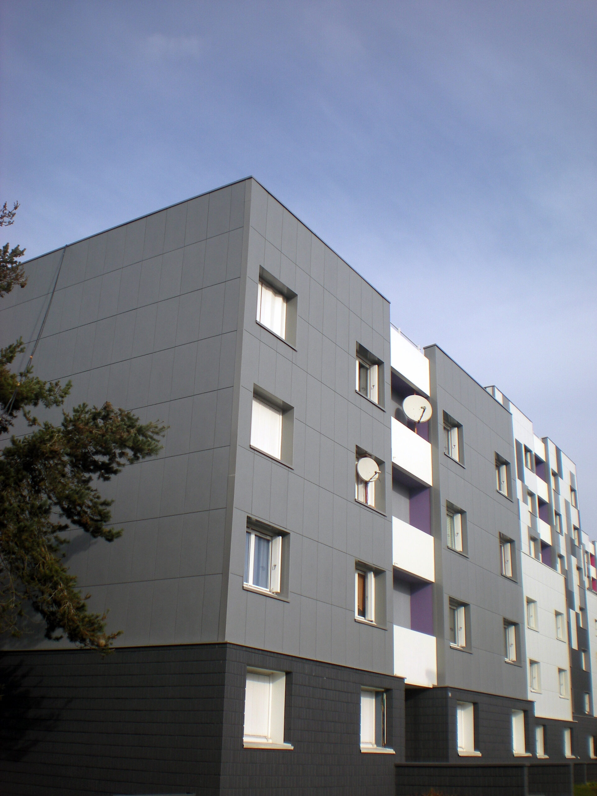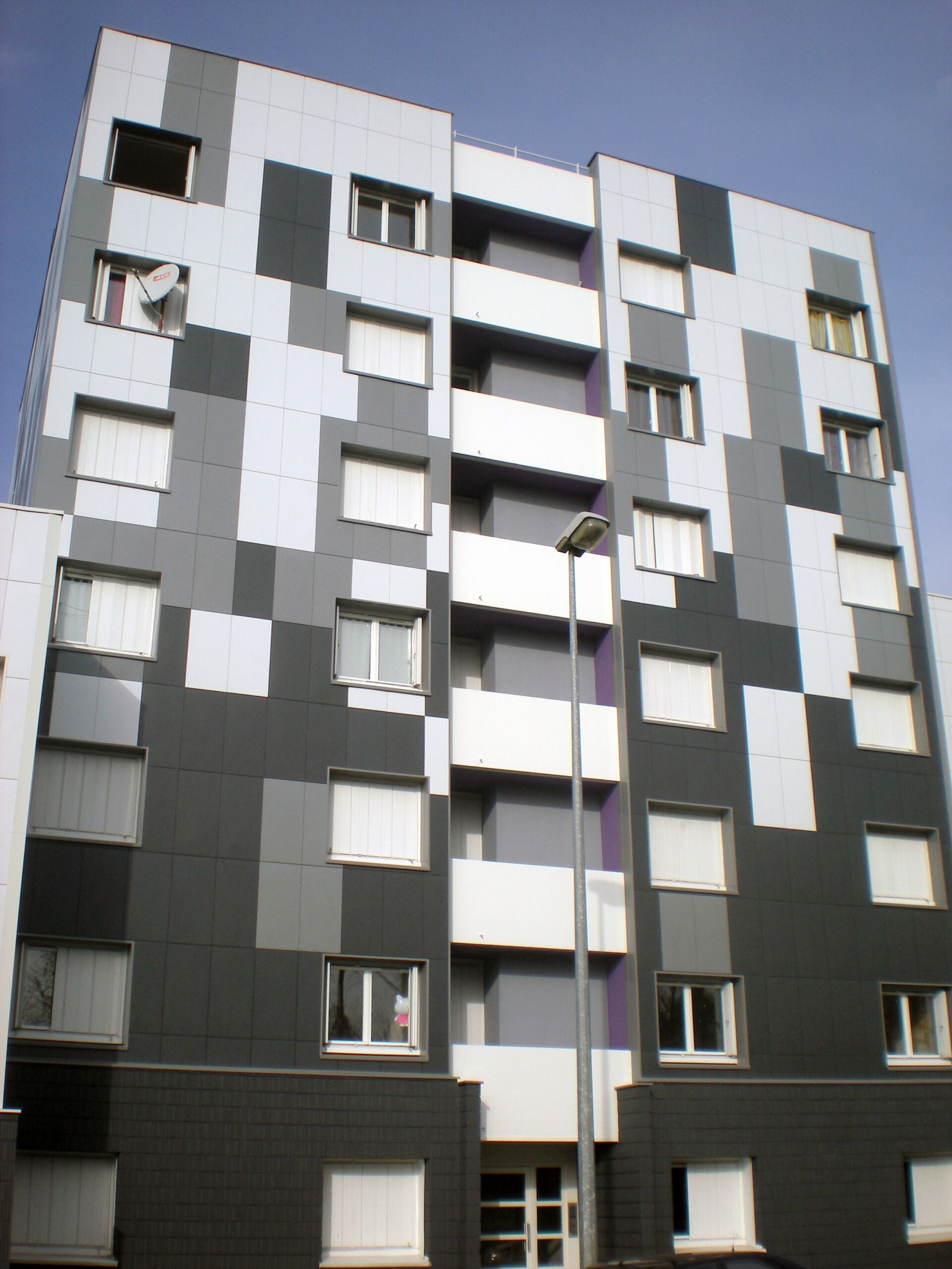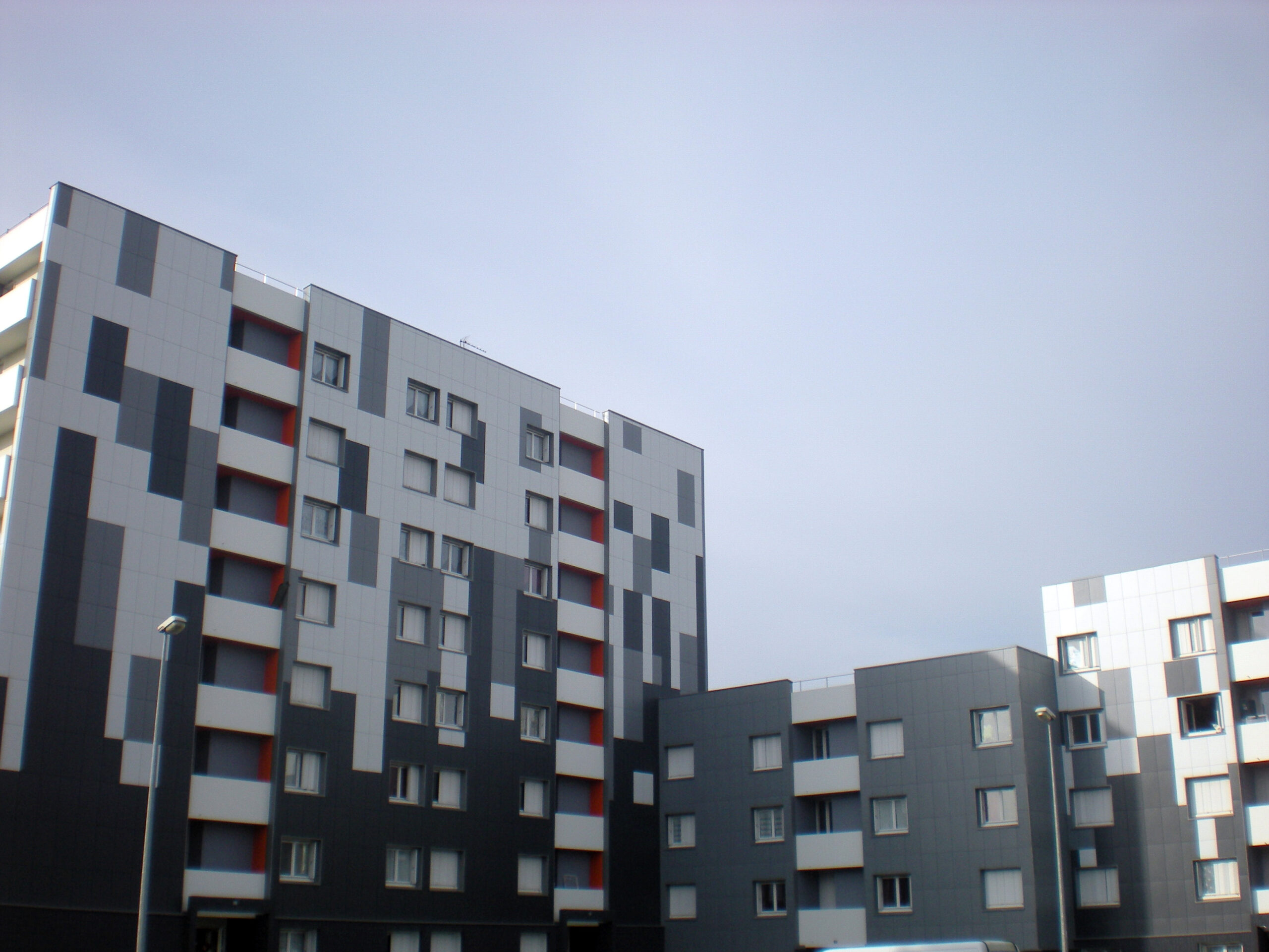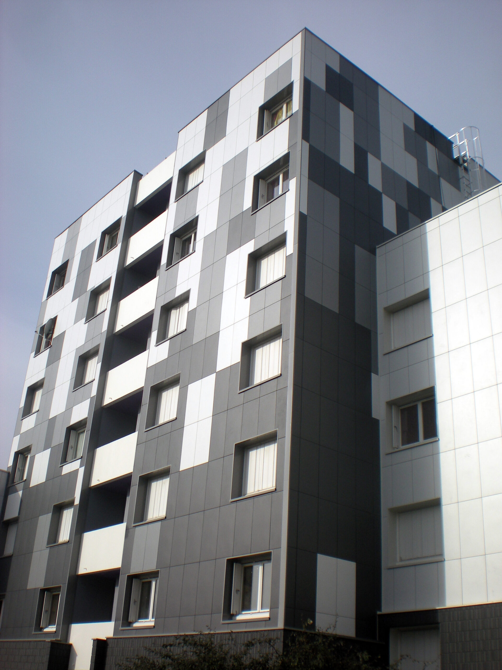 Carea frameless cladding in SMOOTH finish for this apartment building. White, light-grey and dark-grey claddings, plus some bright orange returns, enliven the mosaic-like facade.