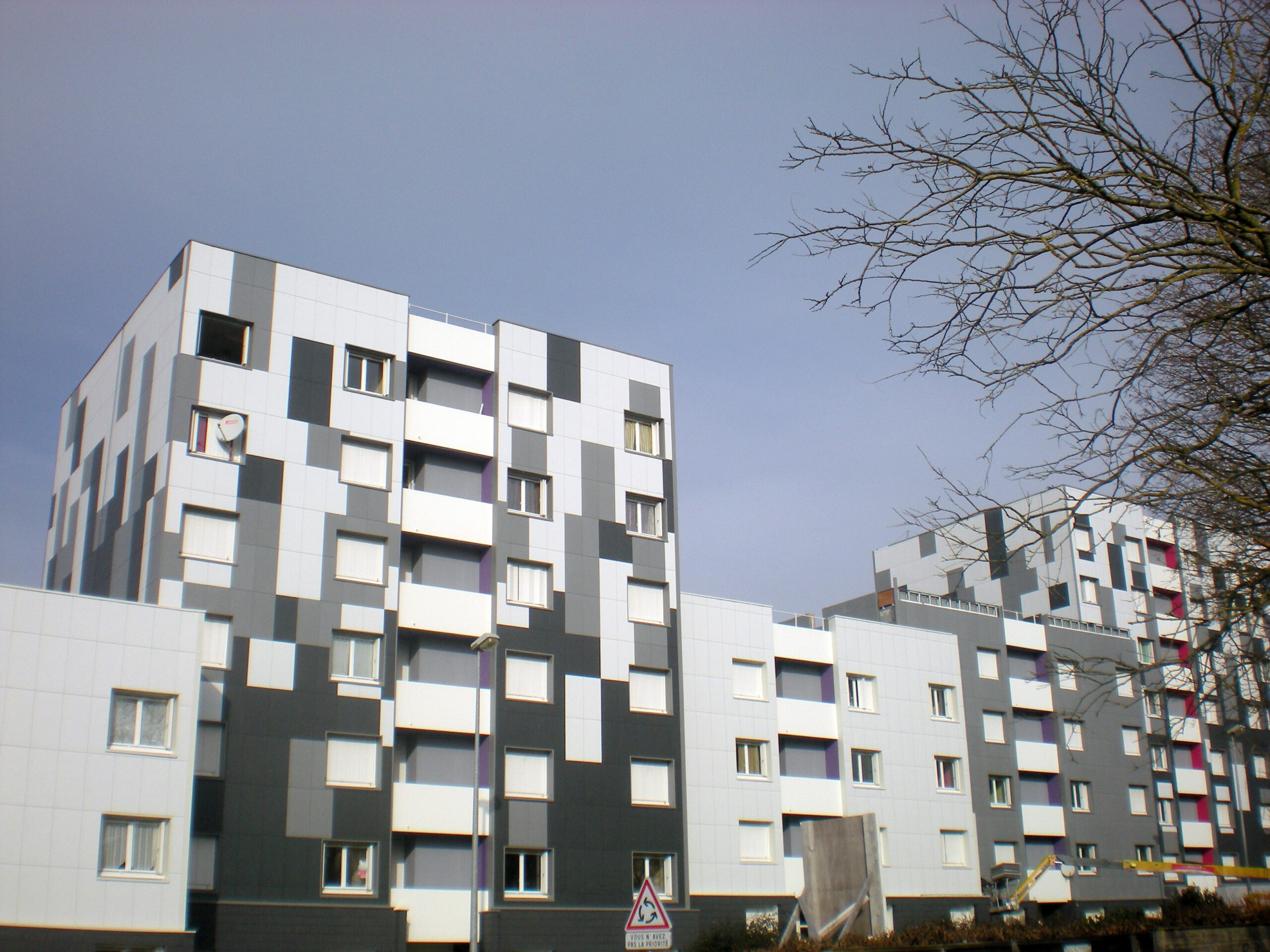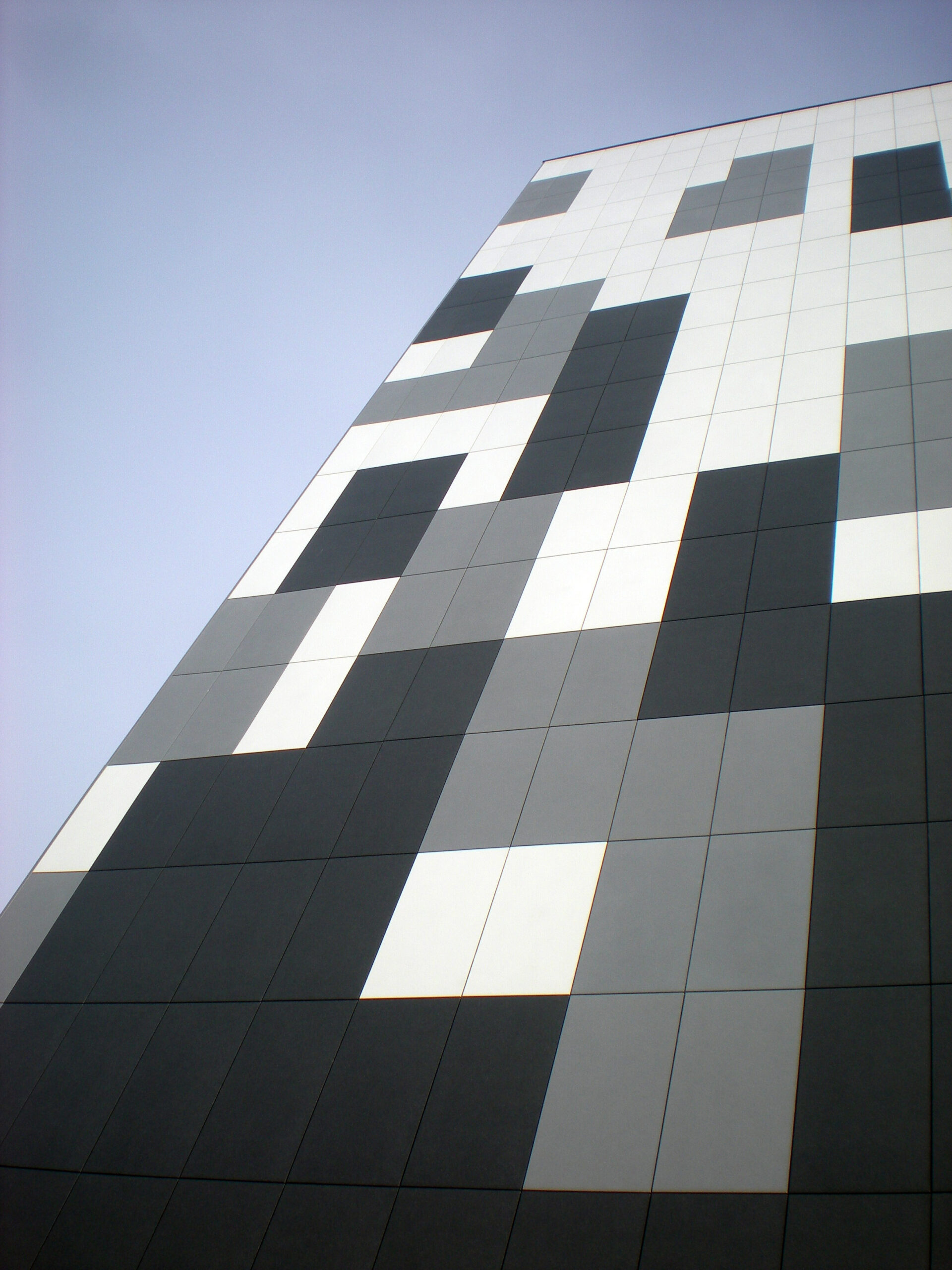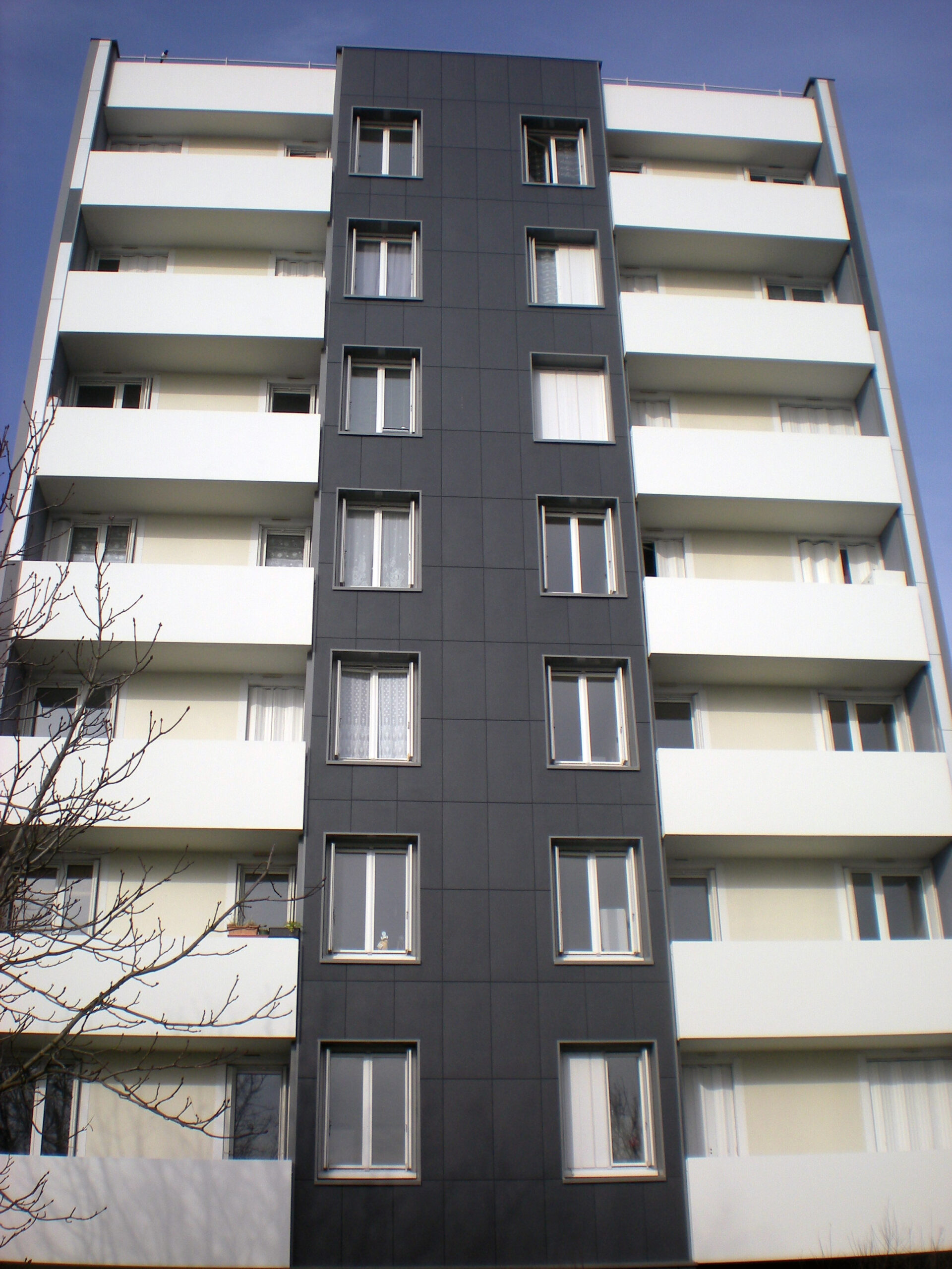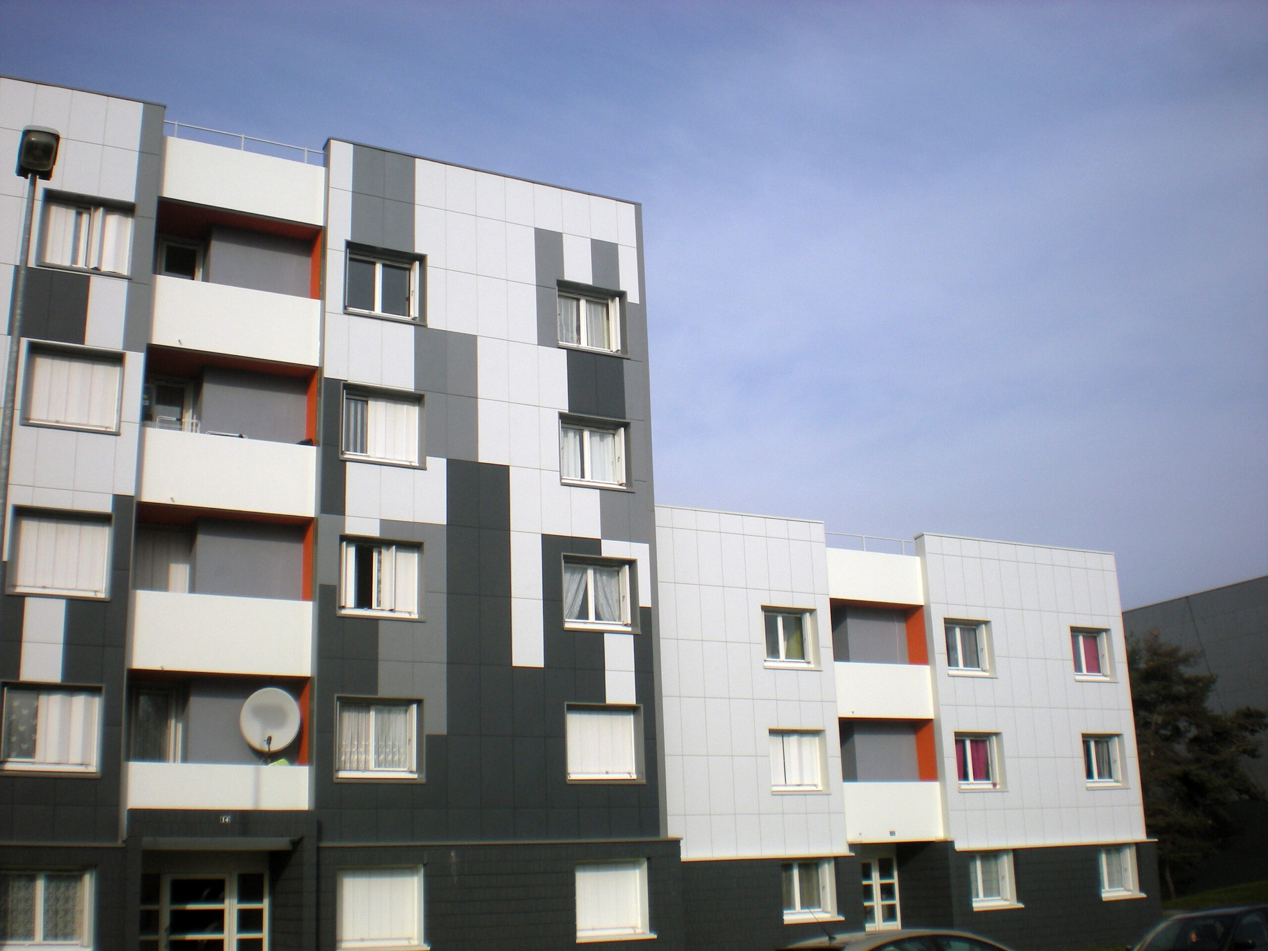 Carea frameless cladding in SMOOTH finish for this apartment building. White, light-grey and dark-grey claddings, plus some bright orange returns, enliven the mosaic-like facade.