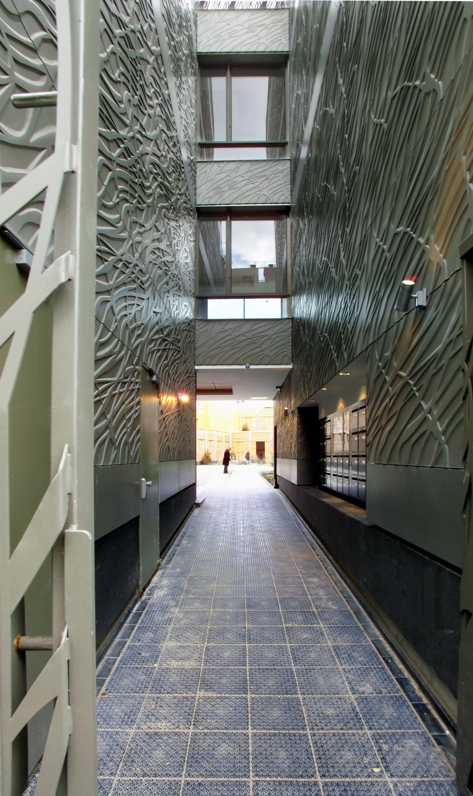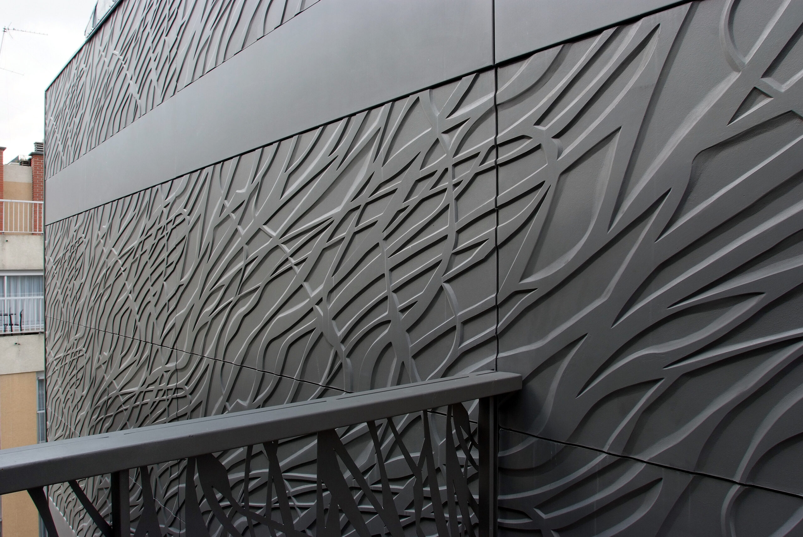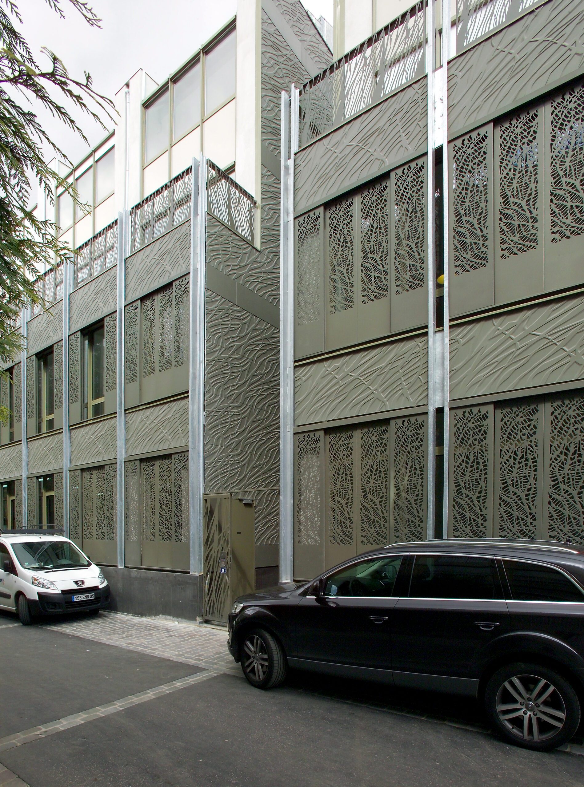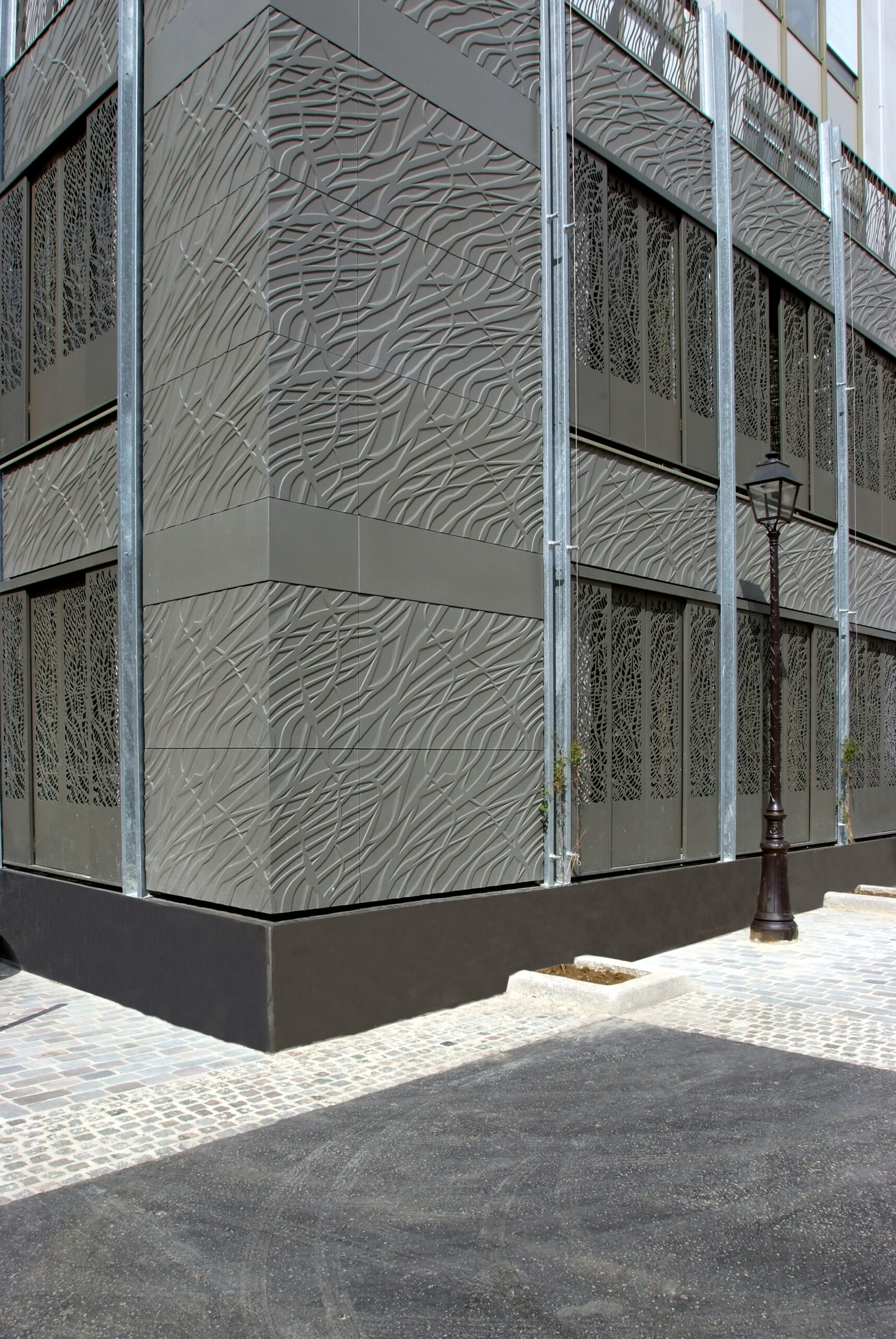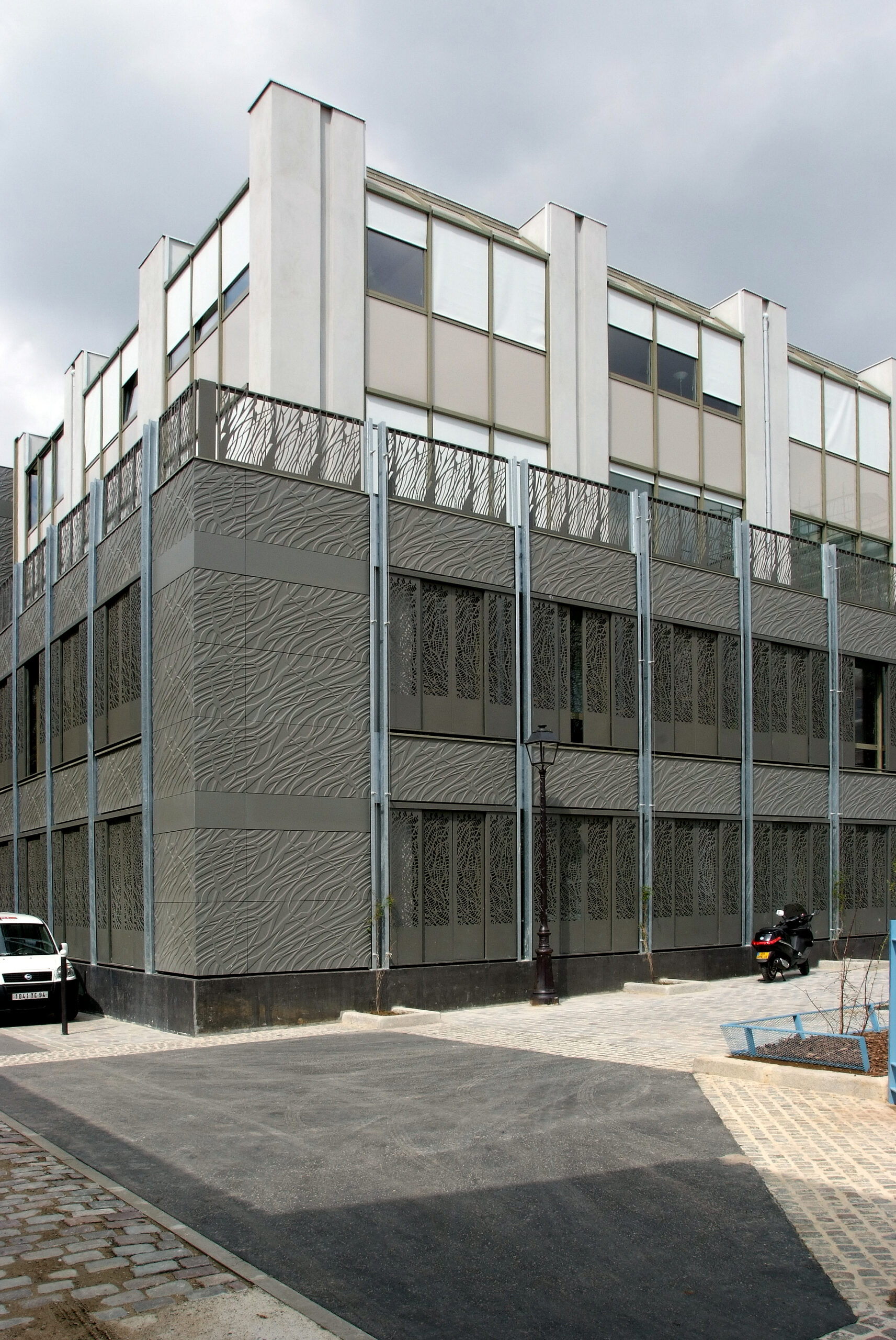 Objectif : concevoir et réaliser une façade double-peau faisant appel à des éléments de bardage issus d’une création de motifs végétaux, conçus à partir de matrices réalisées par Florence Bougnoux, dans l’esprit « arts and crafts » très représentatif des activités artisanales du Faubourg.