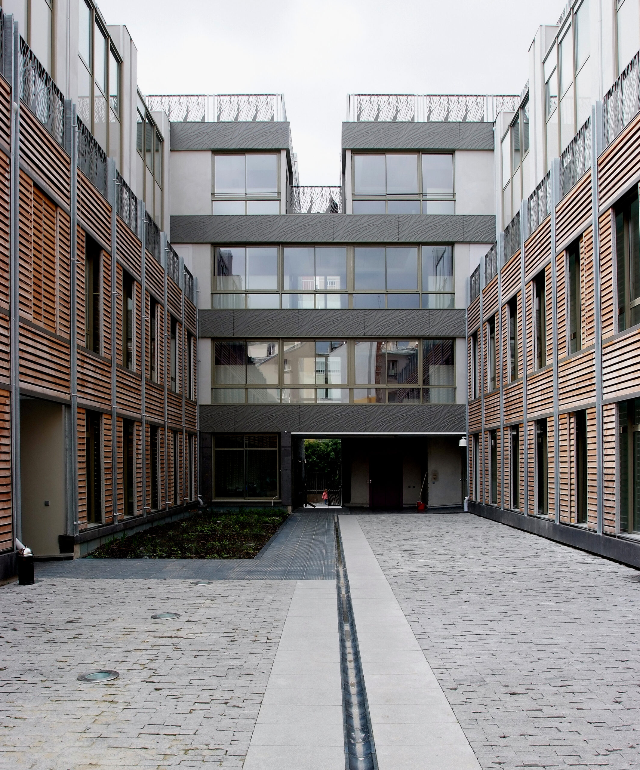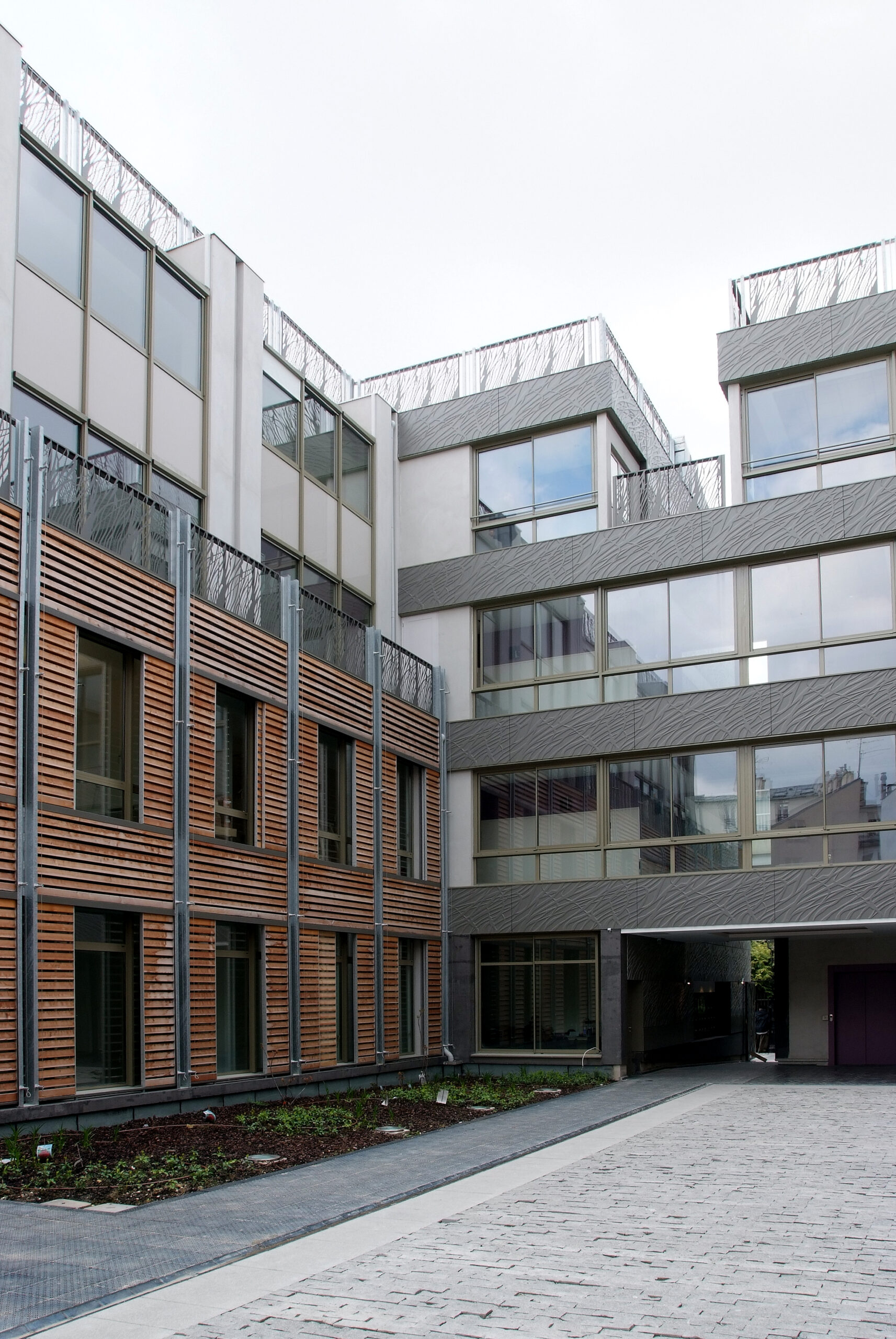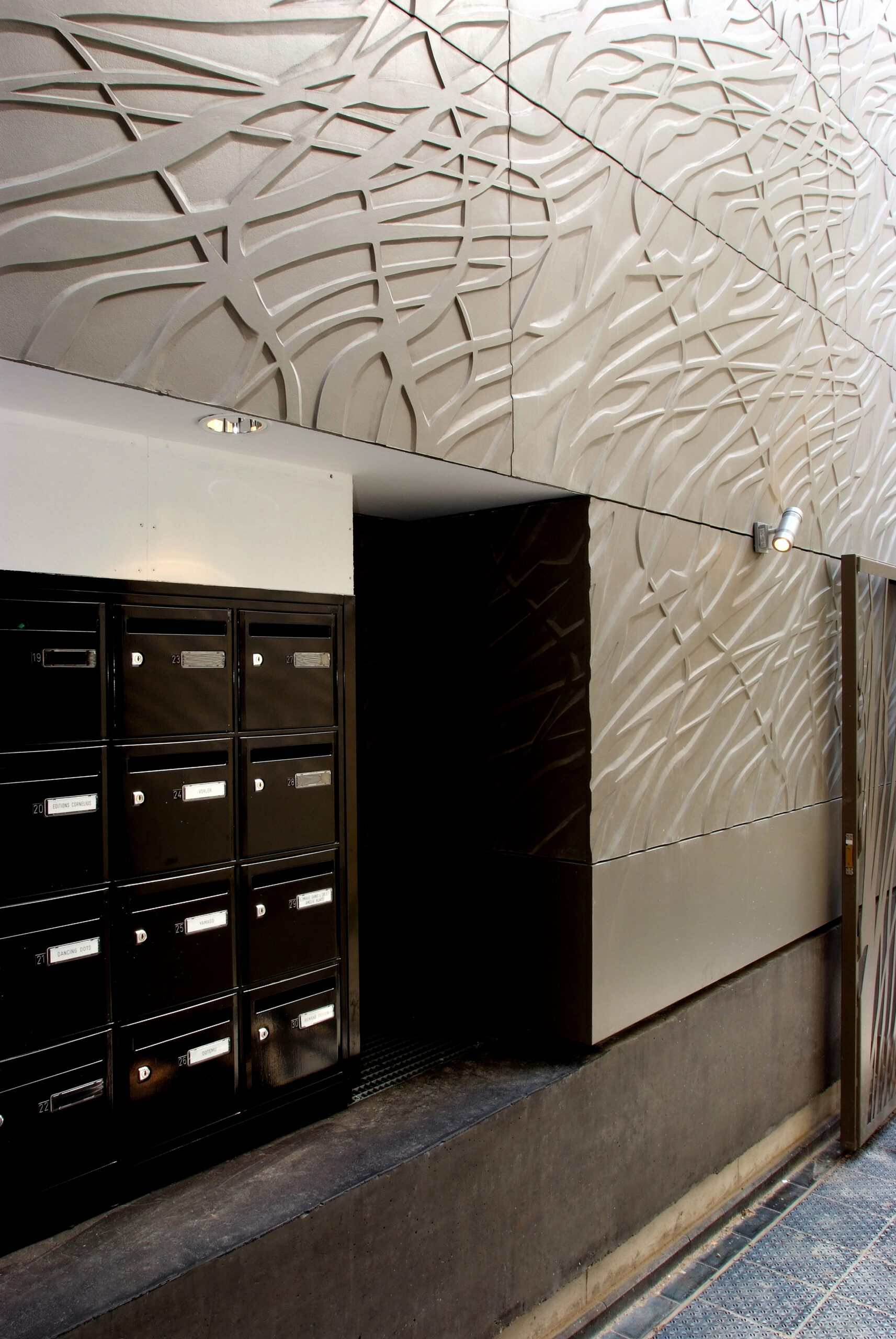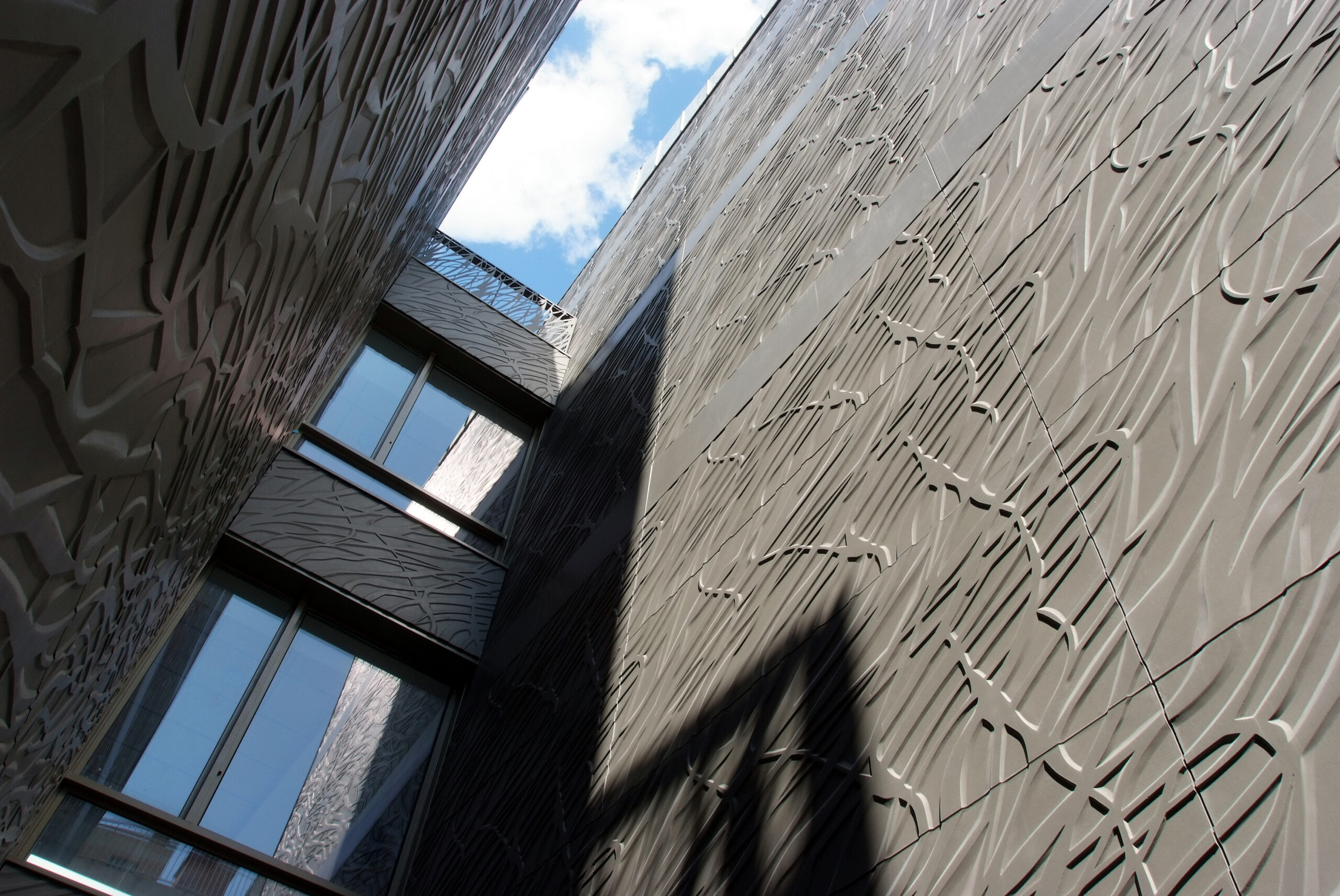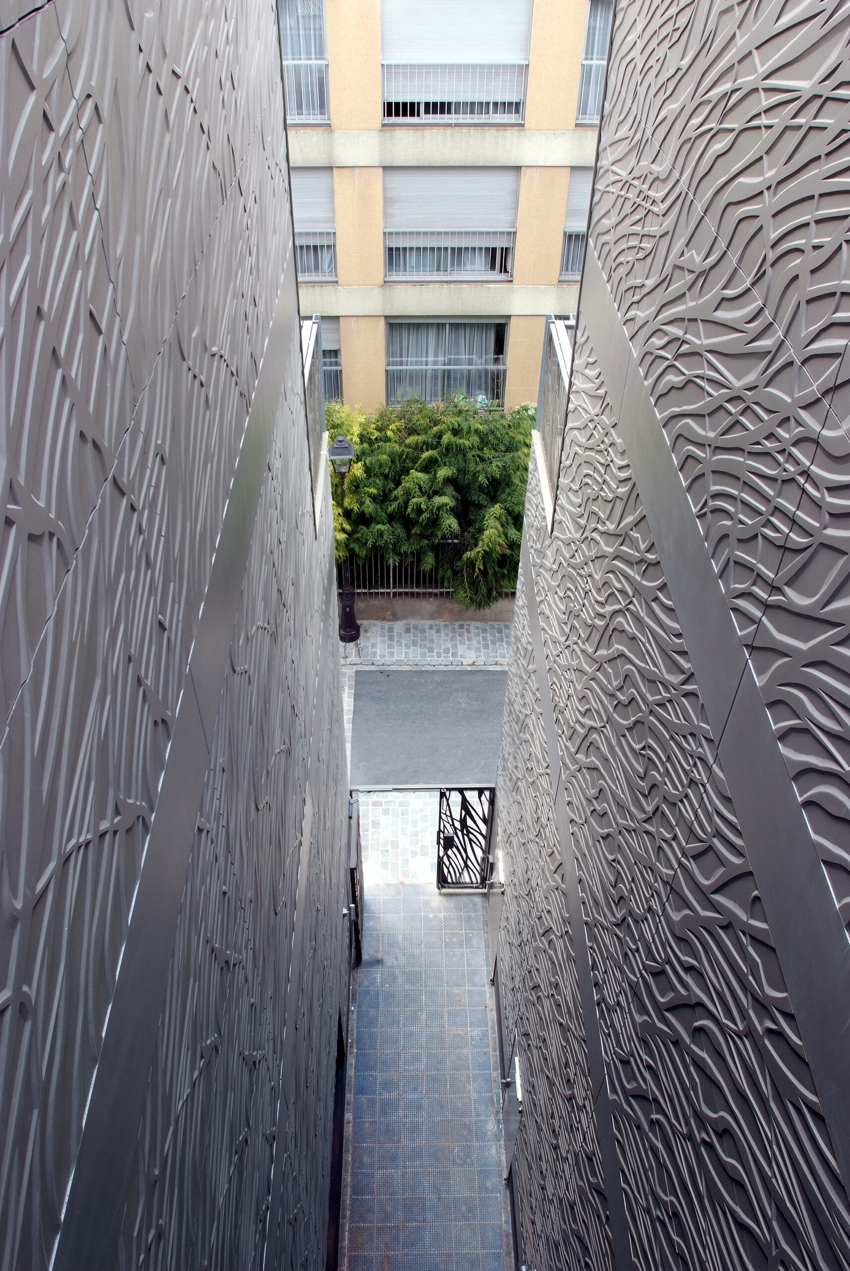 Objectif : concevoir et réaliser une façade double-peau faisant appel à des éléments de bardage issus d’une création de motifs végétaux, conçus à partir de matrices réalisées par Florence Bougnoux, dans l’esprit « arts and crafts » très représentatif des activités artisanales du Faubourg.